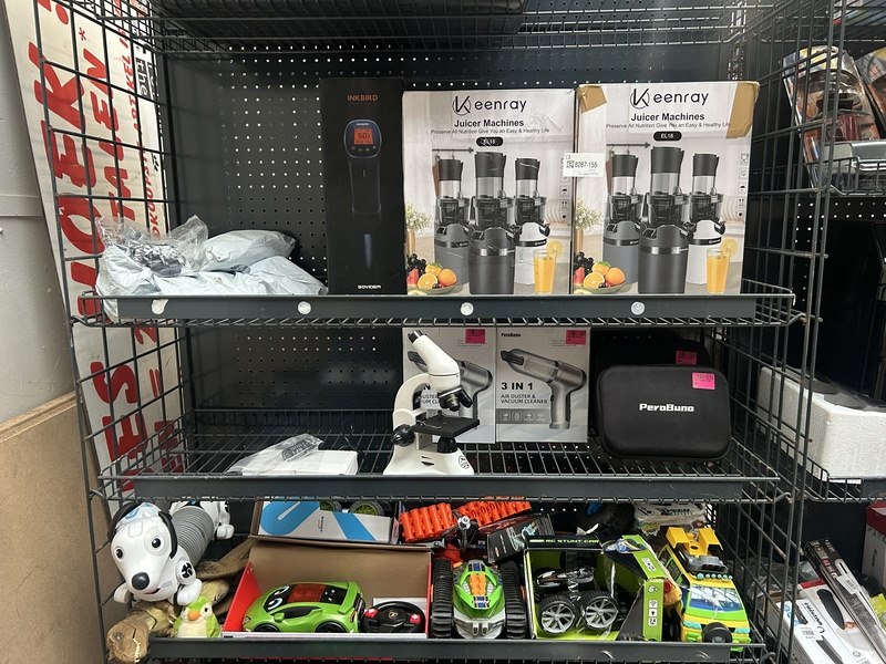 Merk: w.o. Keenray, Perobuno Product: Inhoud stellingvak w.o. juicemaker, vacuumcleaner, divers speelgoed Specificaties: Nieuw, showroom modellen en demo modellen. Verpakking beschadigd. Niet compleet.