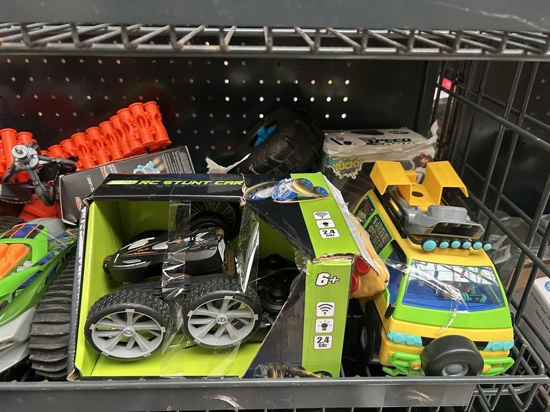 3x inhoud stellingvak w.o. juicemaker, vacuumcleaner, divers speelgoed w.o. keenray, perobuno
