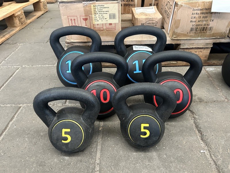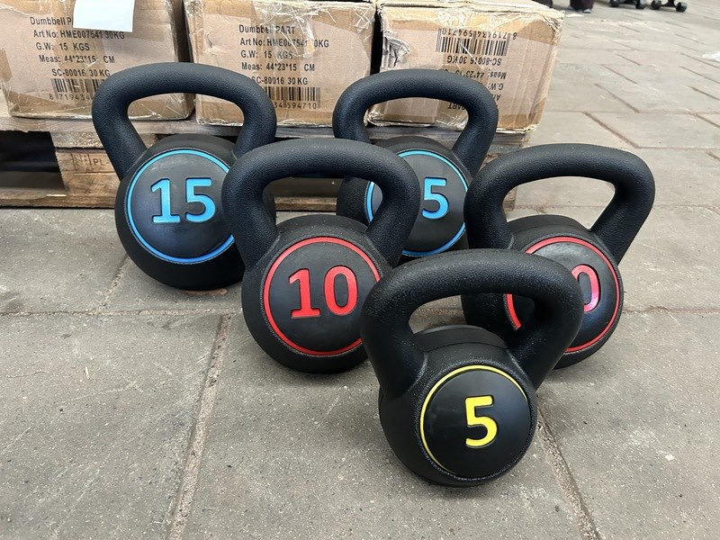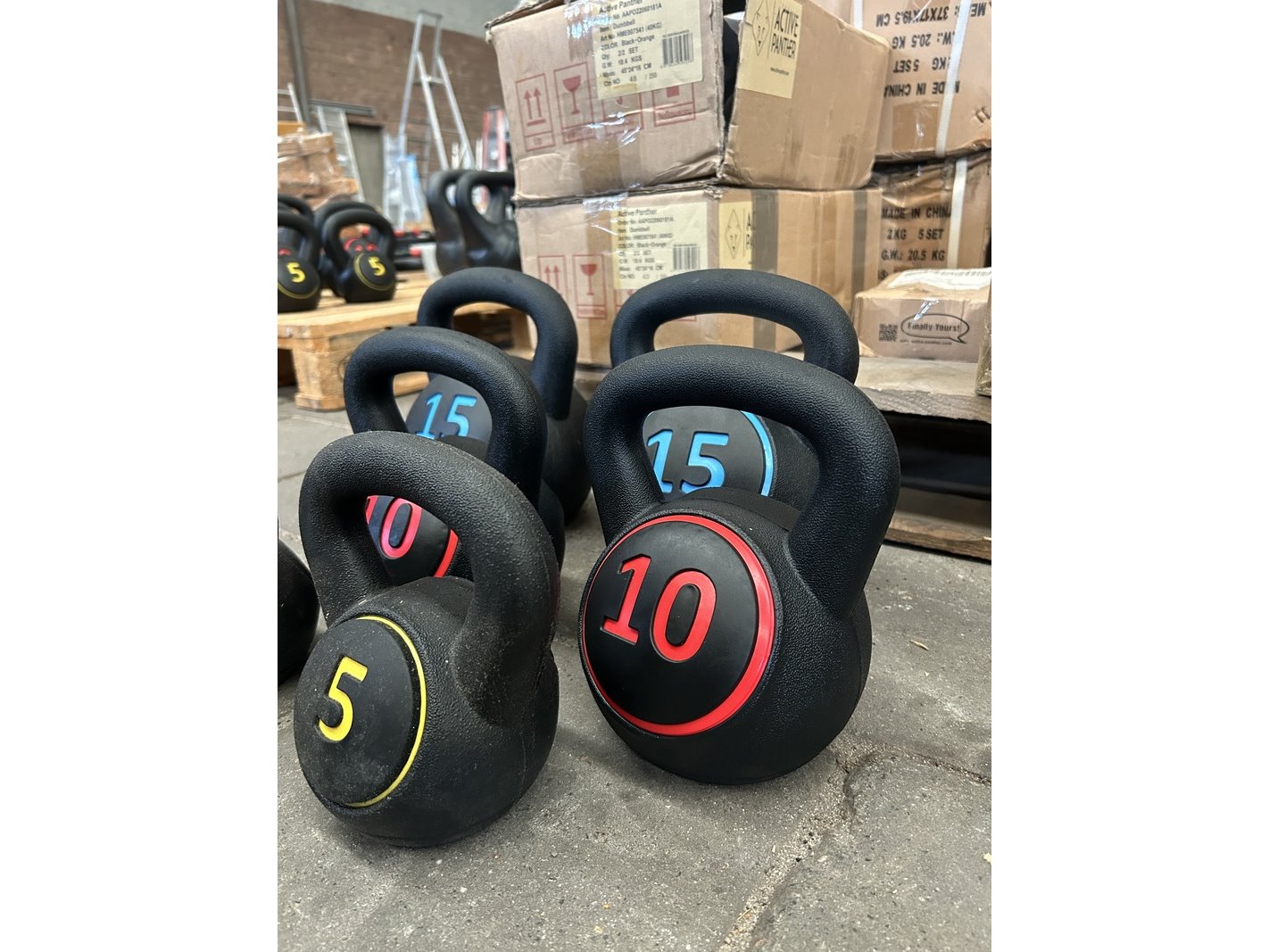 Product: Kettlebell (4x 15kg, 4x 10kg, 3x 5kg) Specificaties: Nieuw en showroom modellen.