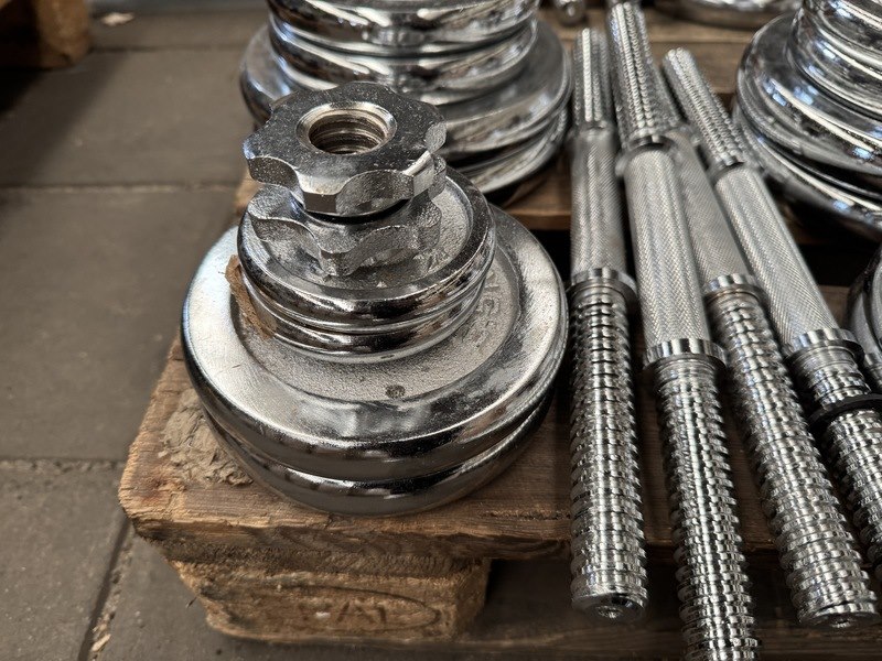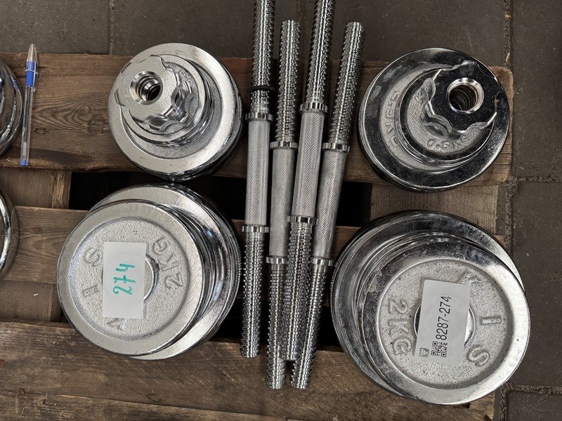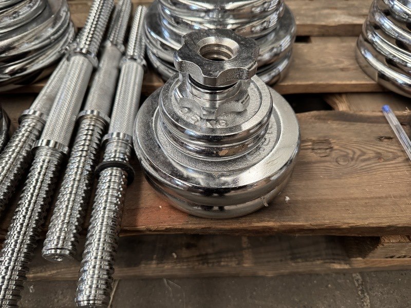 Product: Haltersets (totaal 16 halterschijven: 4x 5 kg, 4x 2,5 kg, 4x 2 kg, 4x 0,5 kg) Conditie: nieuw Specificaties: 4x stang Totaal halterschijven: 4x 5 kg, 4x 2,5 kg, 4x 2 kg, 4x 0,5 kg)