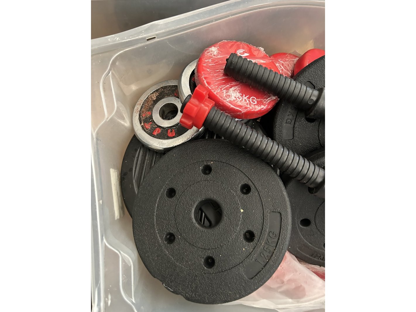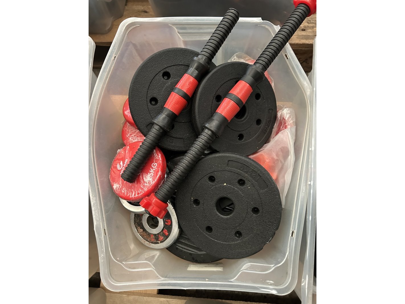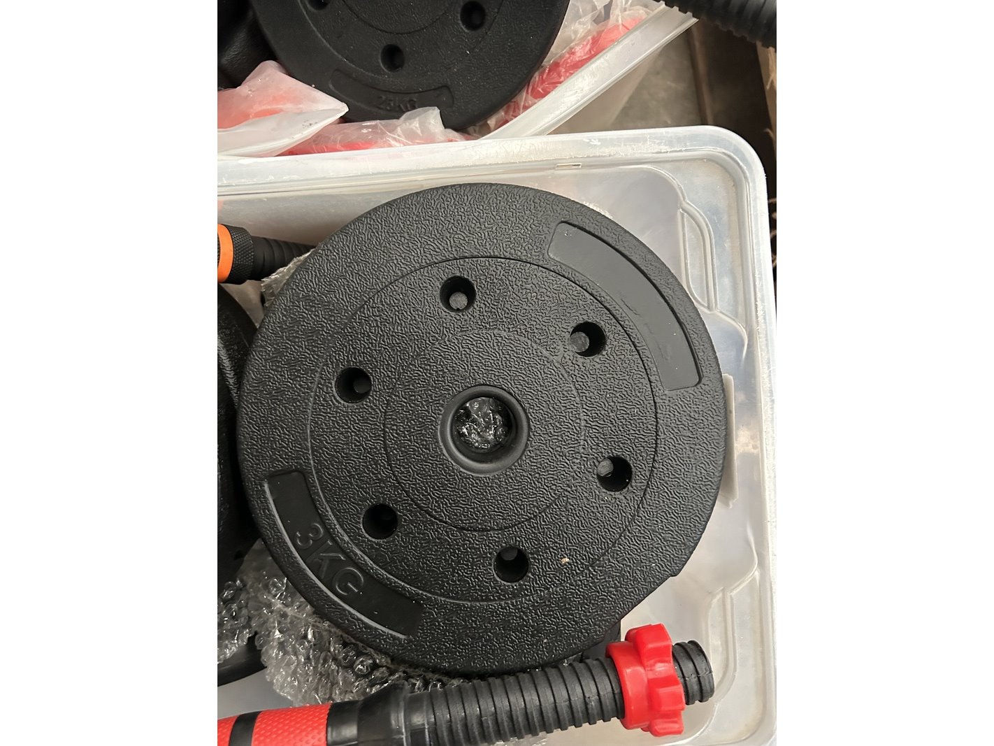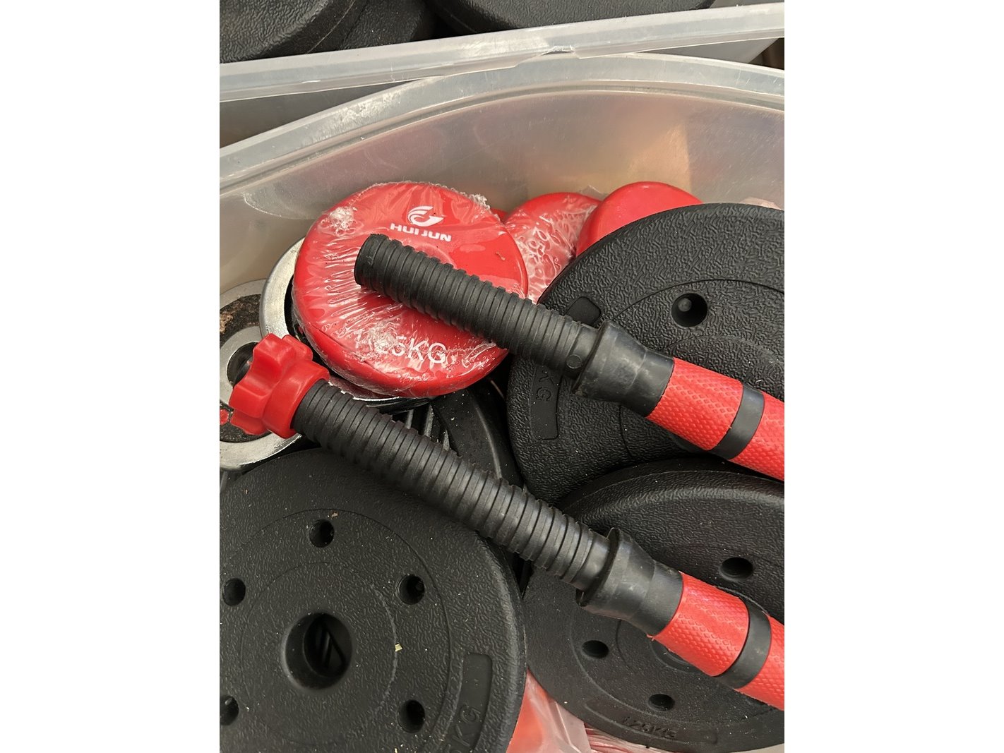 Product: Halterset met diverse halterschijven Specificaties: Nieuw en showroom modellen.