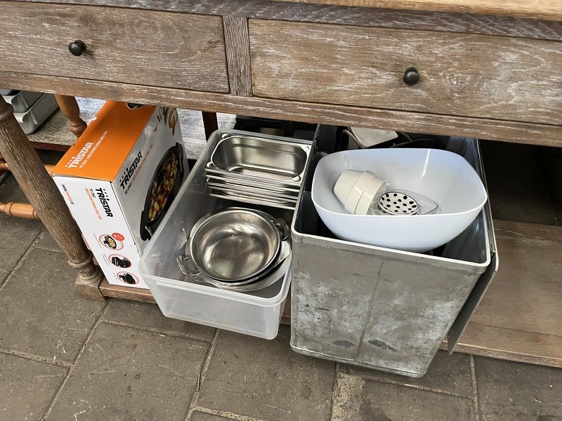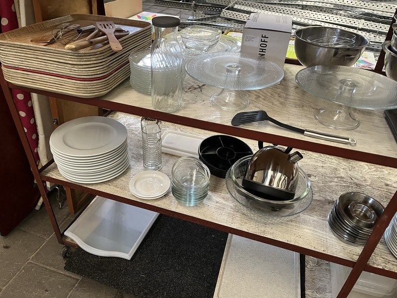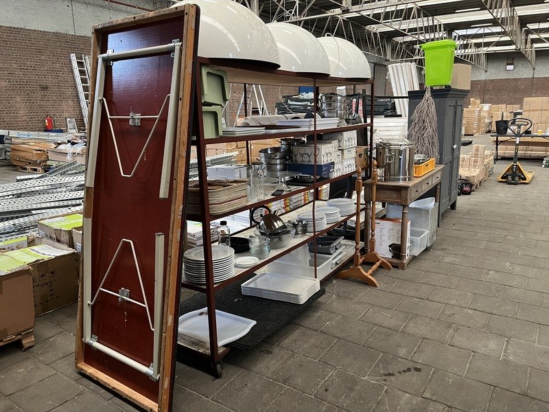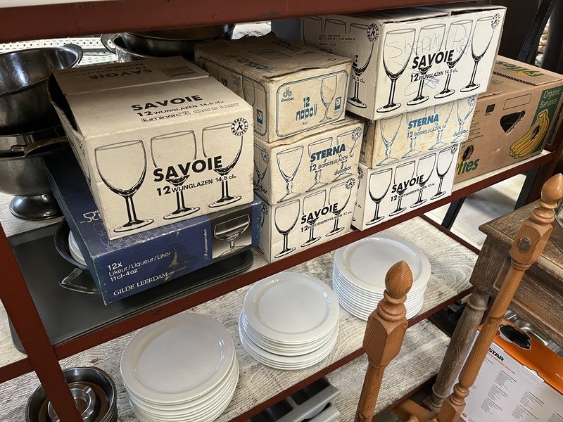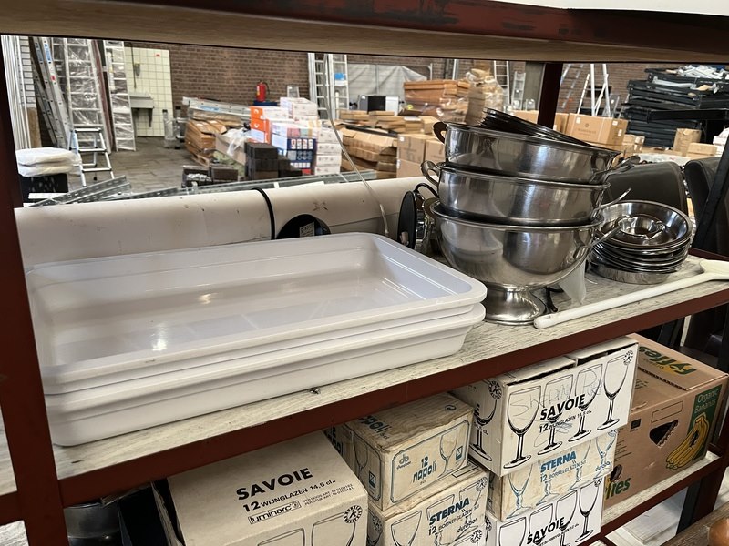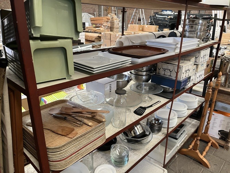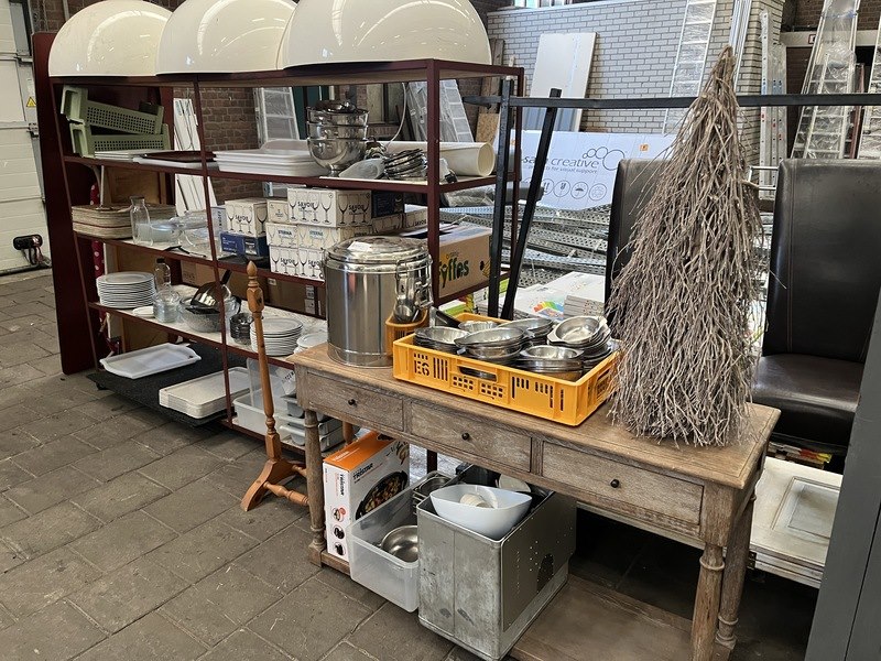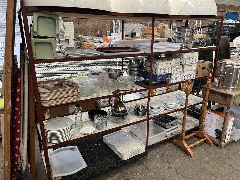 Product: Inhoud horeca magazijn Specificaties: Nieuw, demo modellen en gebruikt. W.o. stellingen, verlichting, servies, meubels, apparatuur, glaswerk.