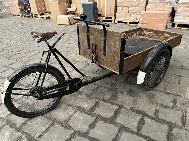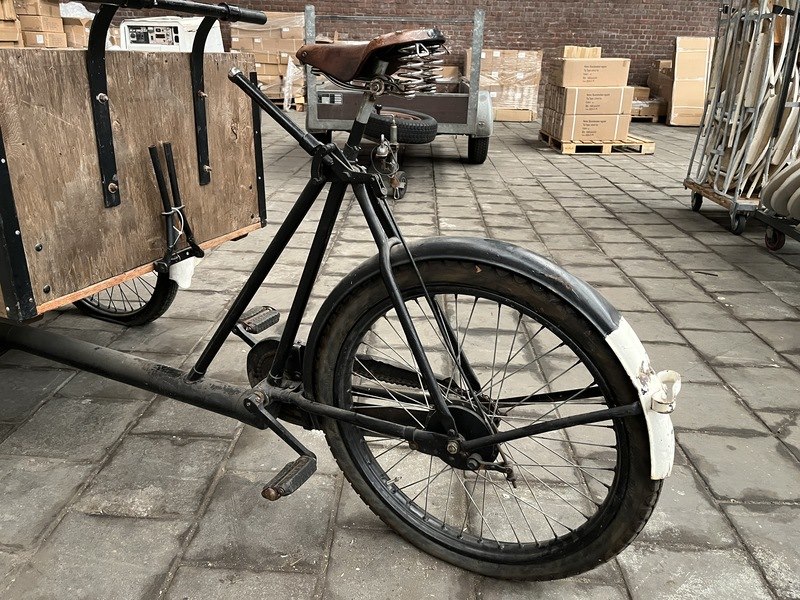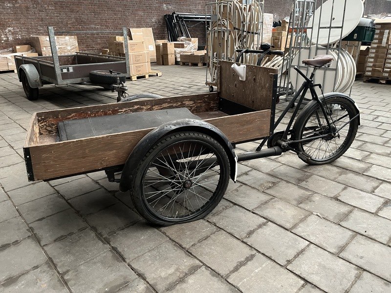 Product: Vintage bakfiets Afmeting: lxb 270x109 cm Conditie: gebruikt Specificaties: De bakfiets heeft lekke banden.