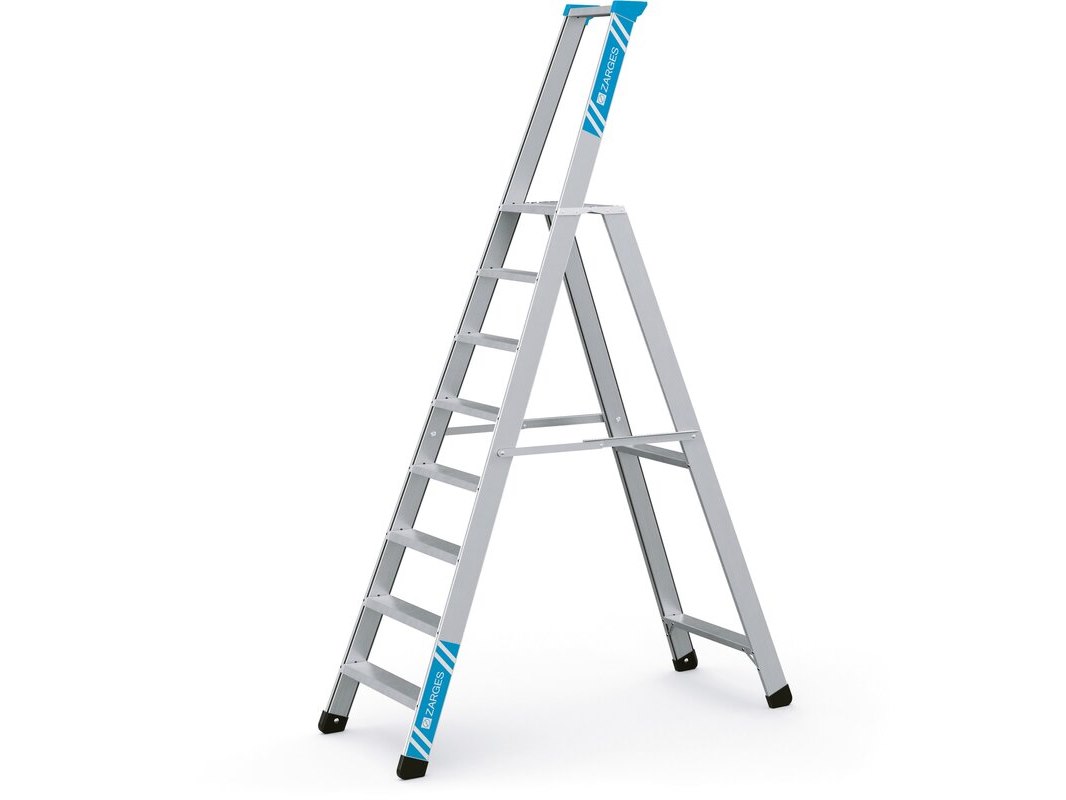 Merk: Zarges Product: Trap met veiligheidsplatform 8 treden Specificaties: Showroom model.
