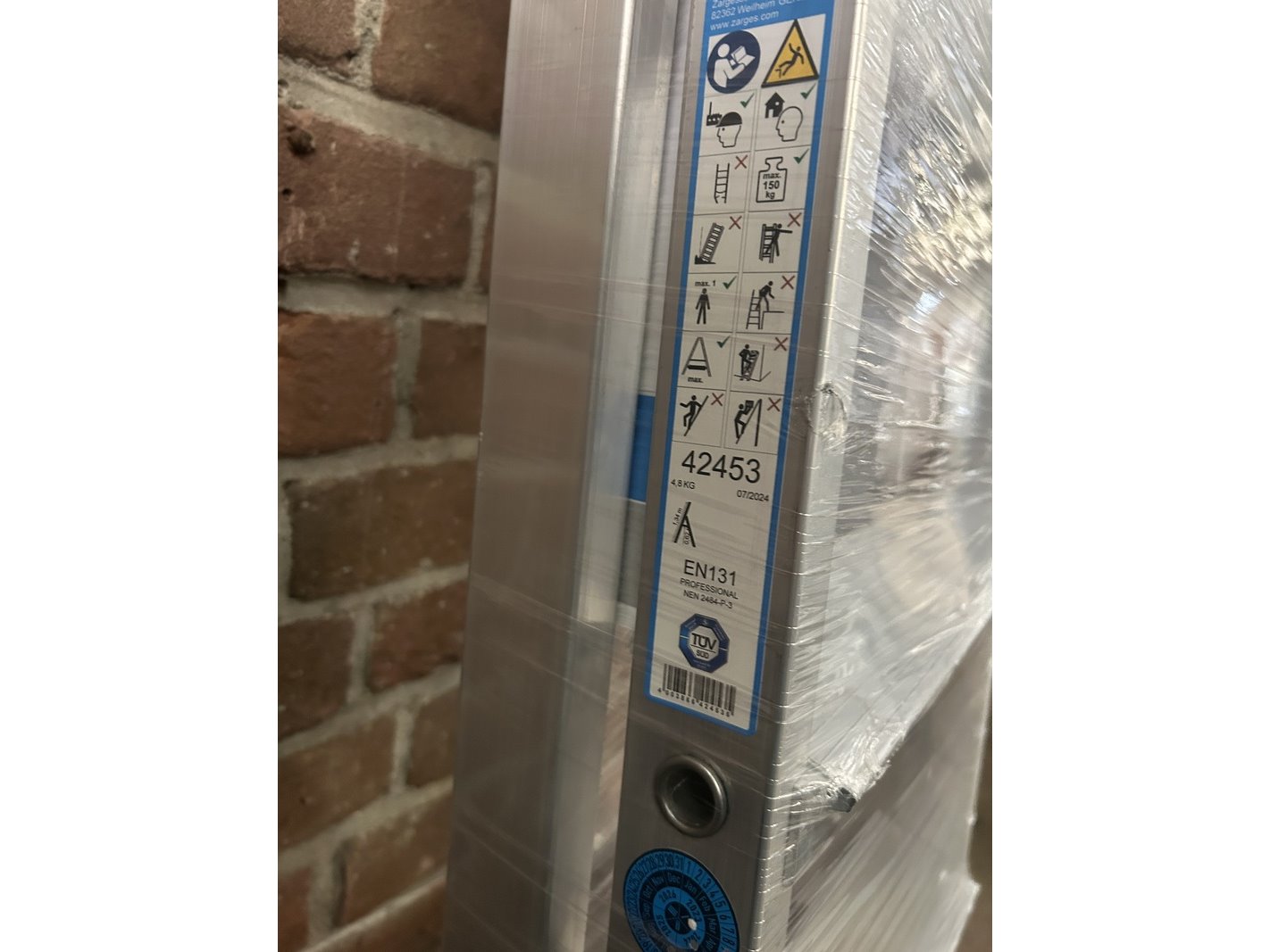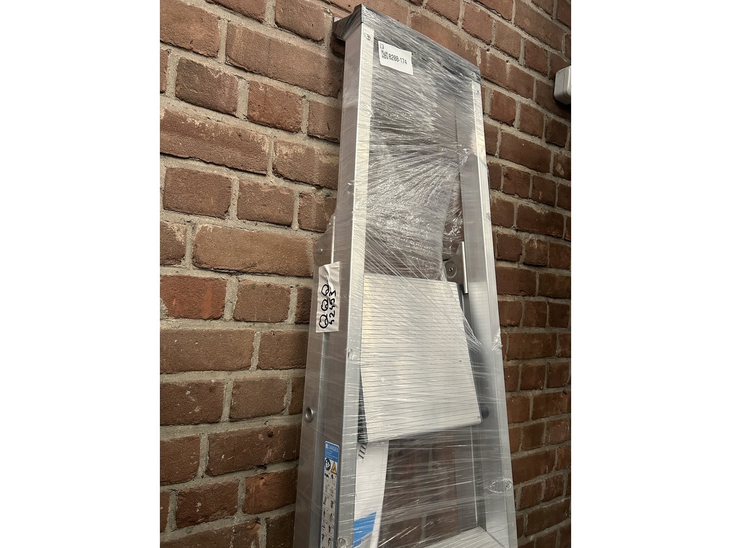 Merk: Zarges Product: Huishoudtrap/geribbelde staande sportladder 3 treden Specificaties: Showroom model. Aantal treden incl. platform 3 Buitenmaat 0.42 m Werkhoogte 2.6 m Ladderlengte 1.34 m Platformhoogte 0.61 m Materiaal Aluminium Aantal treden 3