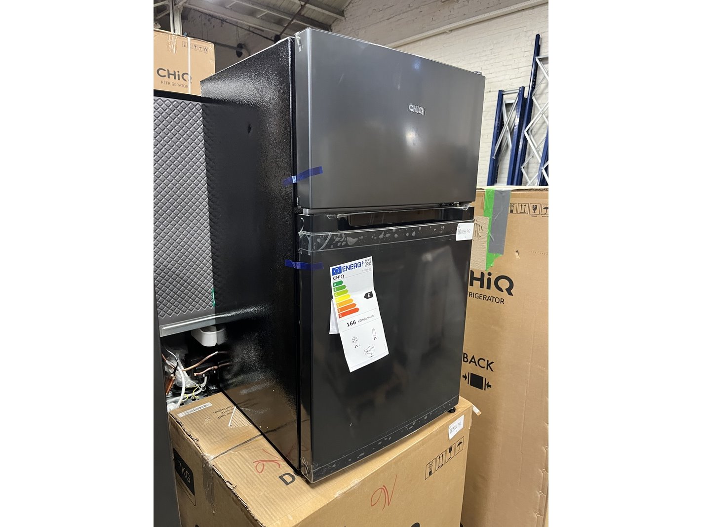 Merk: CHiQ Product: Koel-vriescombinatie 86 liter Afmeting: 470x500x845 mm Conditie: nieuw Specificaties: Beschadigd door transport.