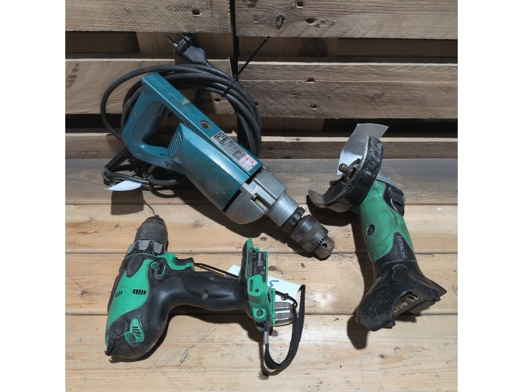 Merk: Makita & HITACHI Product: Klopboormachine, boor-schroefmachine & haakse slijper Conditie: Gebruikt Specificaties: Bestaande uit • Klopboormachine, Makita 8419B • Accu boor-schroefmachine, HITACHI DS 18DSL, 2016 • Accu haakse slijper, HITACHI G 18DSL(S), 2016