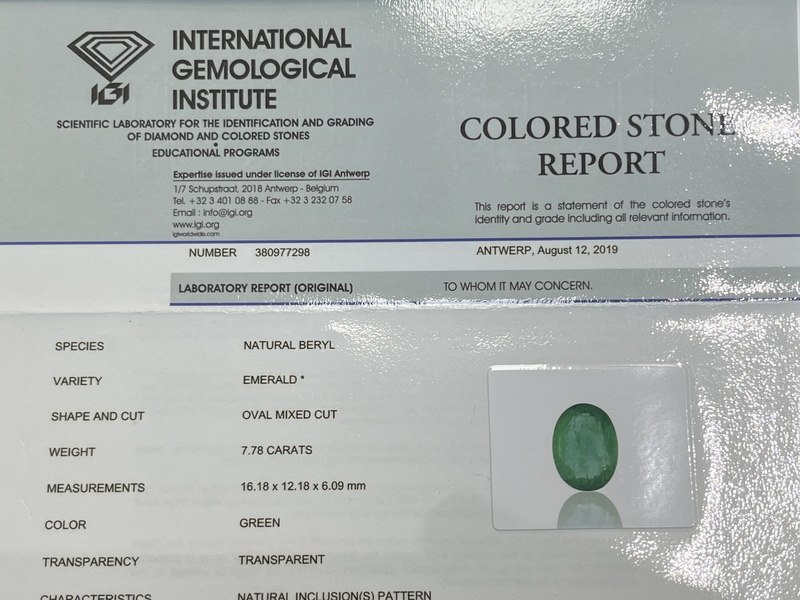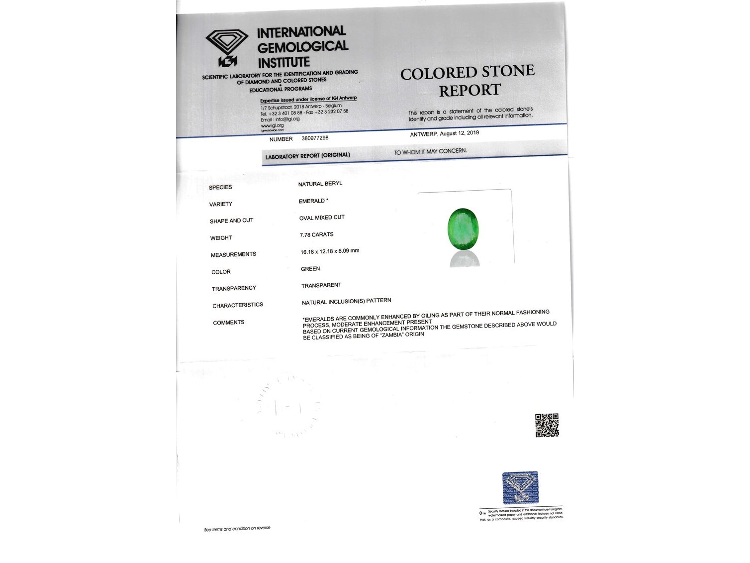 Product: Edelsteen - 7.78 carat groene smaragd (gecertificeerd) Specificaties: Edelsteen: Smaragd Aantal: 1 stuk Slijpvorm: Ovaal Gewicht (carat): 7.78 carat Kleur: Groen Zuiverheid: Met insluitsels Certificaat: IGI Certificaat nummer: 380977298 Conditie: Nieuw Verpakking: Edelsteendoos Toelichting: De kwaliteit is overgenomen van het rapport behorend bij item. De waardebepaling is een beoordeling van een gecertificeerde diamantair, gebaseerd op consumentenprijzen. Consumentenprijs: € 9.900,- Ring kan als het mogelijk is op maat gemaakt worden.