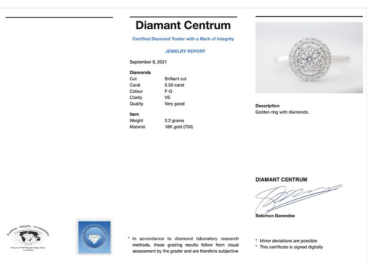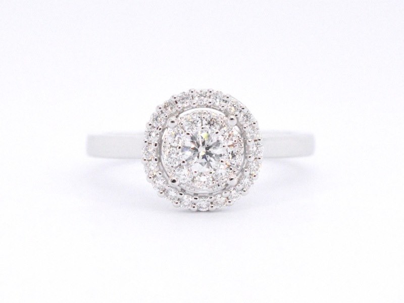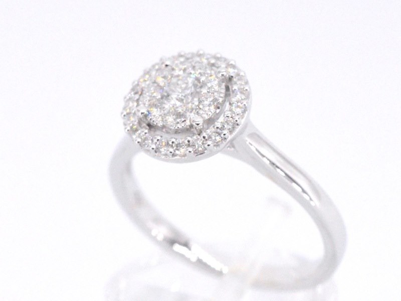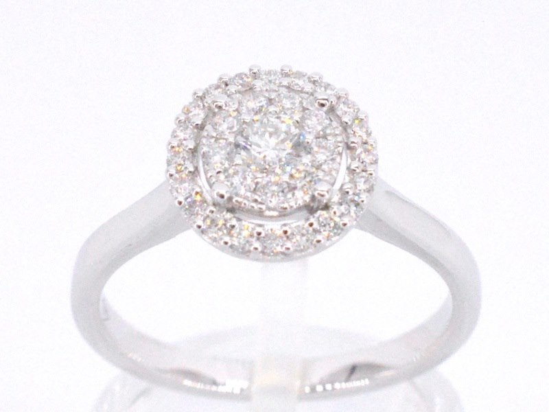 Product: Witgouden entourage ring vol gezet met diamanten Specificaties: Aantal: 30 stuks Slijpvorm: Briljant geslepen Gewicht (carat): 0.50 carat Kleur: F-G Zuiverheid: VS Slijpkwaliteit: Zeer mooi Juweel: Ring Gewicht: 3.2 gram Ringmaat (op maat gemaakt*): 53 (17 mm) Materiaal: 18K goud (750) Conditie: Nieuw Verpakking: Luxe sieradendoos Toelichting: De kwaliteit is overgenomen van het rapport behorend bij item. De waardebepaling is een beoordeling van een gecertificeerde diamantair, gebaseerd op consumentenprijzen. Consumentenprijs: € 4.760,- Ring kan als het mogelijk is op maat gemaakt worden.