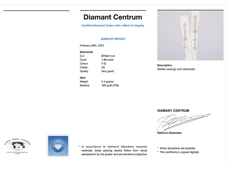 Product: Witgouden oorhangers met briljant geslepen diamanten Specificaties: Diamant: Natuurlijk Slijpvorm: Briljant geslepen Gewicht (carat): 1.80 carat Kleur: F-G Zuiverheid: VS Slijpkwaliteit: Zeer mooi Juweel: Oorhanger Gewicht: 5.4 gram Afmetingen/lengte: 50 mm Materiaal: 18K goud (750) Conditie: Nieuw Verpakking: Luxe sieradendoos Toelichting: De kwaliteit is overgenomen van het rapport behorend bij item. De waardebepaling is een beoordeling van een gecertificeerde diamantair, gebaseerd op consumentenprijzen. Consumentenprijs: € 12.443,- Ring kan als het mogelijk is op maat gemaakt worden.
