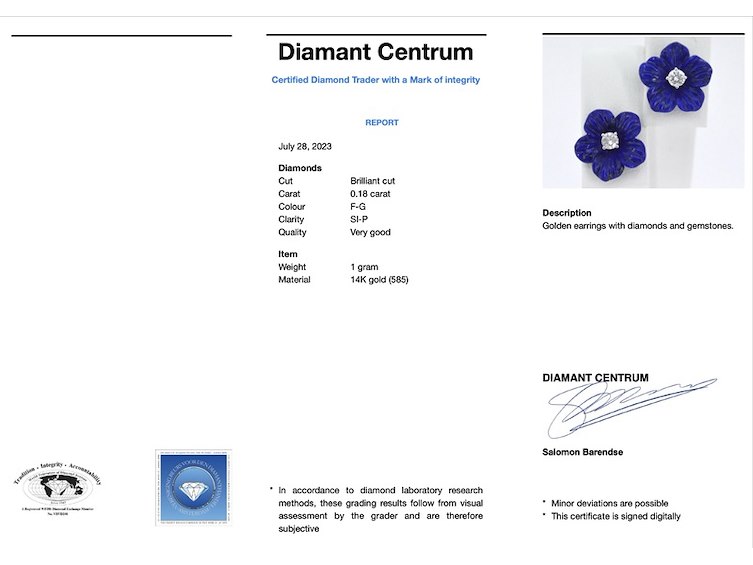 Product: Gouden oorbellen 0.18 carat met blauwe edele bloem en grote diamanten Specificaties: Diamant: Natuurlijk Aantal: 2 stuks Slijpvorm: Briljant geslepen Gewicht (carat): 0.18 carat Kleur: F-G Zuiverheid: SI-P Slijpkwaliteit: Zeer mooi Juweel: Oorbellen Gewicht: 1 gram Afmetingen/lengte: 12 mm Materiaal: 14 karaat (585) Conditie: Nieuw Verpakking: Luxe sieradendoos Toelichting: De kwaliteit is overgenomen van het rapport behorend bij item. De waardebepaling is een beoordeling van een gecertificeerde diamantair, gebaseerd op consumentenprijzen. Extra informatie: de oorbellen kunnen ook zonder bloem gedragen worden Consumentenprijs: € 998,- Ring kan als het mogelijk is op maat gemaakt worden.