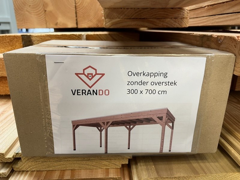 Merk: Verando Product: Douglas overkapping 300*700cm Materiaal: Douglas Conditie: nieuw Specificaties: Deze overkapping bestaat uit hoogwaardige, bezaagde, Europese, Douglas houten onderdelen en wordt geleverd als een compleet pakket inclusief bevestigingsmaterialen en een duidelijke, stapsgewijze handleiding voor de montage. Specificaties: •Palen van 12 × 12 cm •Ringbalk van 5 × 15 cm (bij 400 cm diepte 7,5 x 17,5 cm) •Balklaag van 5 x 15 cm •Dakbeschot van 1,8 cm •Boeiboorden van 2,5 × 20 cm •Schoren van 5 × 15 cm •Bezaagd Europees douglas hout •Inclusief alle benodigde bevestigingsmaterialen •Heldere en gebruiksvriendelijke montagehandleiding