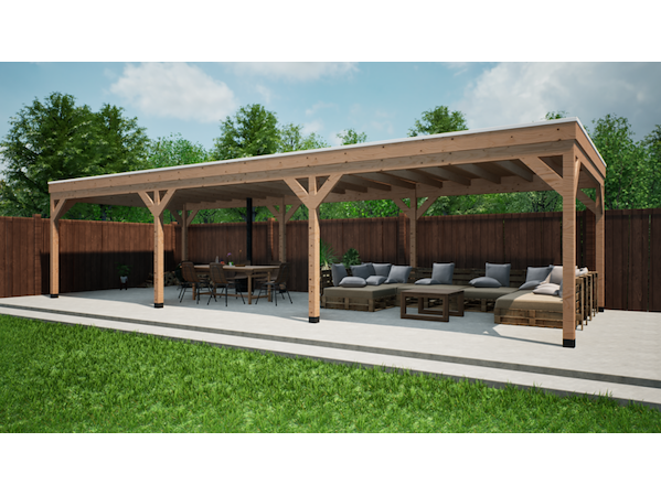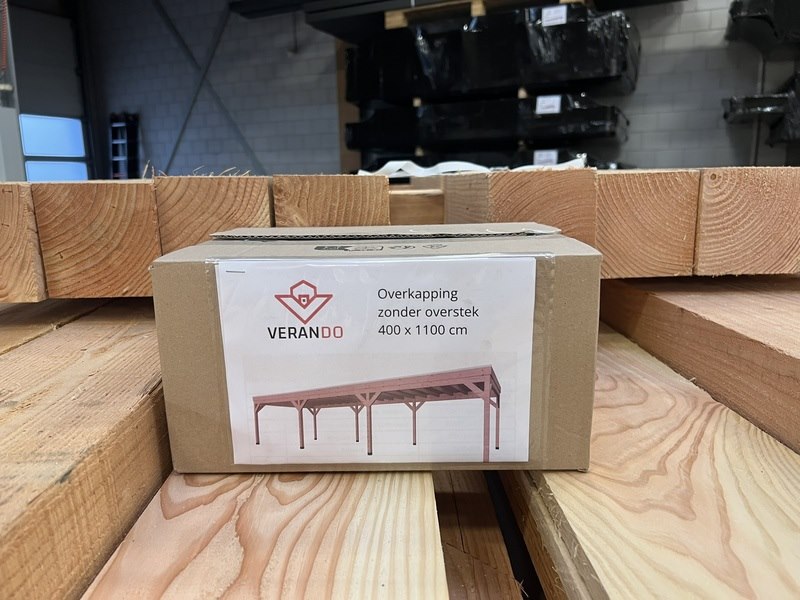Merk: Verando Product: Douglas overkapping 400*1100cm met achterwand Materiaal: Douglas Conditie: nieuw Specificaties: Deze overkapping bestaat uit hoogwaardige, bezaagde, Europese, Douglas houten onderdelen en wordt geleverd als een compleet pakket inclusief bevestigingsmaterialen en een duidelijke, stapsgewijze handleiding voor de montage. Specificaties: •Palen van 12 × 12 cm •Ringbalk van 5 × 15 cm (bij 400 cm diepte 7,5 x 17,5 cm) •Balklaag van 5 x 15 cm •Dakbeschot van 1,8 cm •Boeiboorden van 2,5 × 20 cm •Schoren van 5 × 15 cm •Bezaagd Europees douglas hout •Inclusief alle benodigde bevestigingsmaterialen •Heldere en gebruiksvriendelijke montagehandleiding