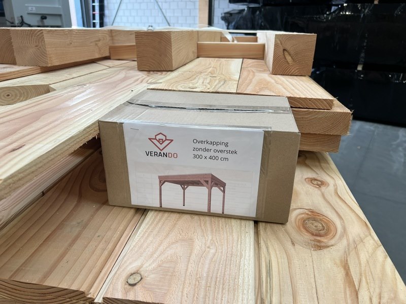 Merk: Verando Product: Douglas overkapping 300*400cm Materiaal: Douglas Conditie: nieuw Specificaties: Deze overkapping bestaat uit hoogwaardige, bezaagde, Europese, Douglas houten onderdelen en wordt geleverd als een compleet pakket inclusief bevestigingsmaterialen en een duidelijke, stapsgewijze handleiding voor de montage. Specificaties: •Palen van 12 × 12 cm •Ringbalk van 5 × 15 cm (bij 400 cm diepte 7,5 x 17,5 cm) •Balklaag van 5 x 15 cm •Dakbeschot van 1,8 cm •Boeiboorden van 2,5 × 20 cm •Schoren van 5 × 15 cm •Bezaagd Europees douglas hout •Inclusief alle benodigde bevestigingsmaterialen •Heldere en gebruiksvriendelijke montagehandleiding