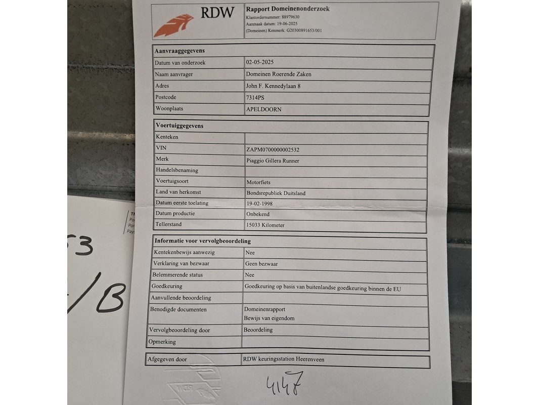 Merk: Piaggio Product: Motorscooter Conditie: gebruikt Specificaties: Kenteken: Niet geregistreerd Eerste toelating nationaal: niet geregistreerd Brandstof: Benzine Afgelezen tellerstand: 15.033 Aantal sleutels: 1 VIN:ZAPM0700000002532 Start: nee (motor gaat rond, slaat niet aan) Waargenomen gebreken gebruikssporen Goedkeuring op basis van buitenlandse goedkeuring binnen de EU.
