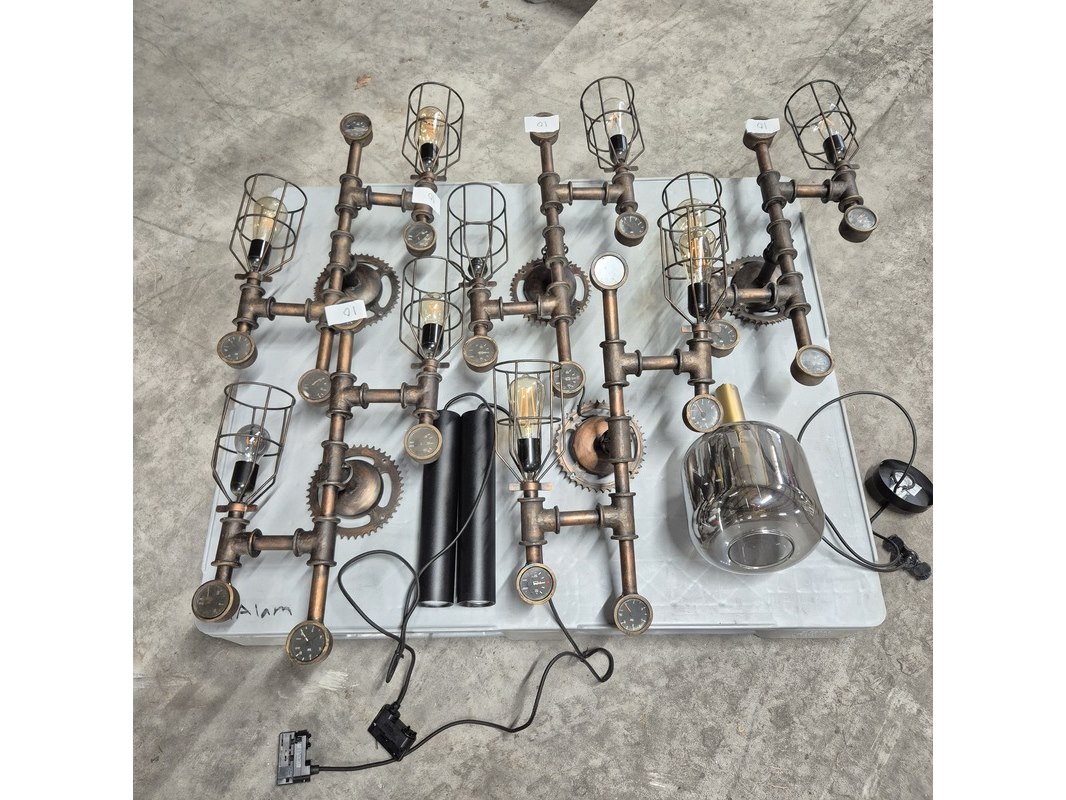 Merk: o.a. Lekar Product: Wandlamp en 3x hanglamp Afmeting: o.a. hxb 70x45 cm Conditie: gebruikt Specificaties: Bestaande uit 5x wandlamp en 3x hanglamp. Werking onbekend Exclusief pallet