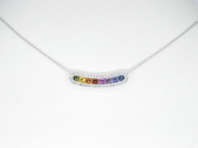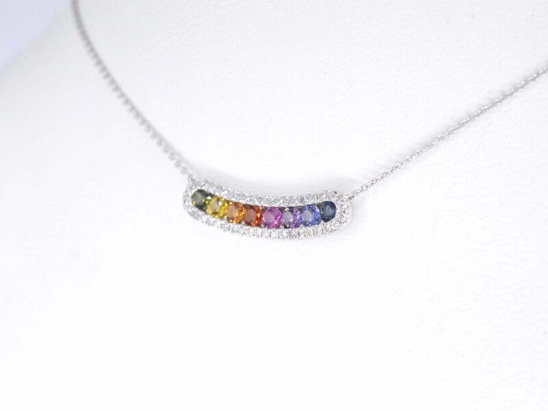 Product: Witgouden collier met multi colour saffieren en diamanten in een rij gezet Specificaties: Diamant: Natuurlijk Aantal: 42 stuks Slijpvorm: Briljant geslepen Gewicht (carat): 0.25 carat Kleur: F-G Zuiverheid: VS Slijpkwaliteit: Zeer mooi Edelsteen: Saffieren Aantal: 8 stuks Slijpvorm: Briljant geslepen Gewicht (carat): 0.70 carat Kleur: Multicolour Slijpkwaliteit: Very good Juweel: Hanger (incl. Ketting) Gewicht: 3.1 gram Afmetingen/lengte: 42 cm Materiaal: 18K goud (750) Conditie: Nieuw Verpakking: Luxe sieradendoos Toelichting: De kwaliteit is overgenomen van het rapport behorend bij item. De waardebepaling is een beoordeling van een gecertificeerde diamantair, gebaseerd op consumentenprijzen. Consumentenprijs: € 4.218,-