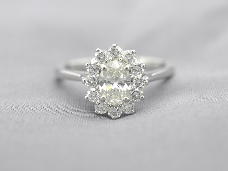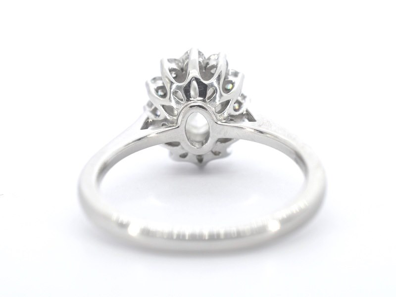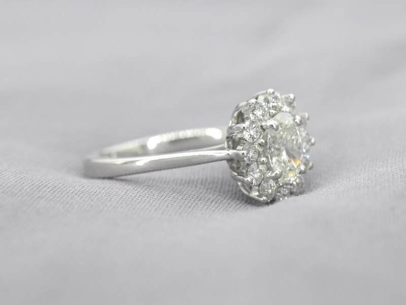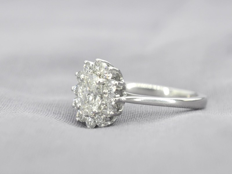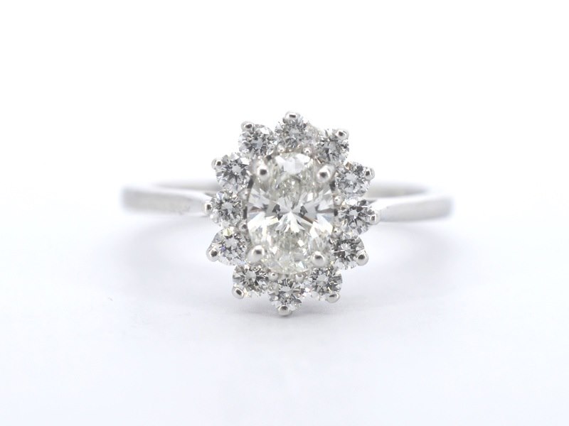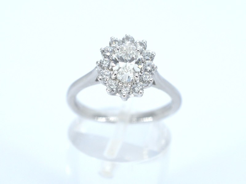 Product: Platina entourage ring met een ovale diamant Specificaties: Diamant: Natuurlijk Aantal: 1 stuks Slijpvorm: Ovaal geslepen Gewicht (carat): 0.60 carat Kleur: H Zuiverheid: SI1 Slijpkwaliteit: Very good Certificaat: GIA Certificaat nummer: 2151376087 Diamant (secundair): Natuurlijk Aantal diamanten: 12 stuks Slijpvorm: Rond geslepen Gewicht (carat): 0.40 carat Kleur: F Zuiverheid: VS Slijpkwaliteit: Zeer mooi Juweel: Ring Gewicht: 5 gram Ringmaat (op maat gemaakt*): 52 (16.5 mm) Materiaal: Platina PT 950 Conditie: Zo goed als nieuw Verpakking: Luxe sieradendoos Toelichting: De kwaliteit is overgenomen van het rapport behorend bij item. De waardebepaling is een beoordeling van een gecertificeerde diamantair, gebaseerd op consumentenprijzen. Consumentenprijs: € 9.600,-