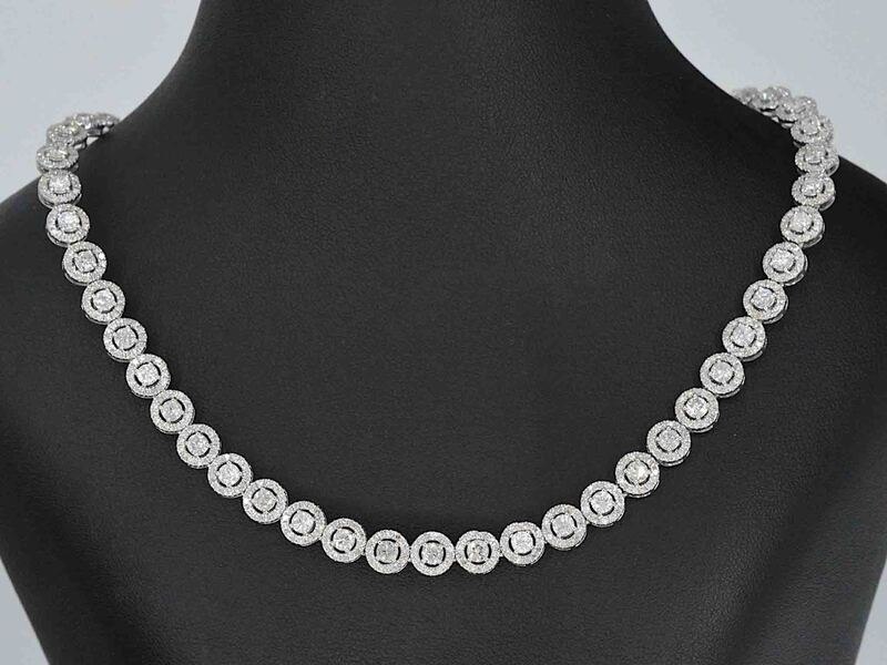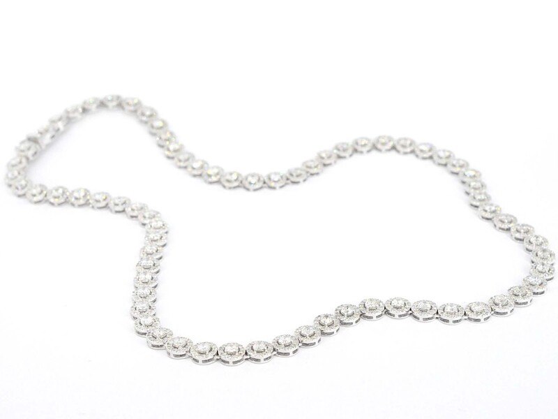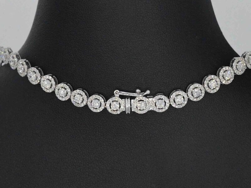 Product: Witgouden collier volledig met diamanten 13.00 carat Specificaties: Diamant: Natuurlijk Aantal: 71 stuks (grote) Slijpvorm: Briljant geslepen Gewicht (carat): 8.50 carat Kleur: F-G Zuiverheid: SI-P Slijpkwaliteit: goed Diamant (secundair): Kleine diamanten Aantal diamanten: 994 stuks Slijpvorm: Rond geslepen Gewicht (carat): 4.50 carat Kleur: F-G Zuiverheid: VS-SI Slijpkwaliteit: Mooi Juweel: Collier Gewicht: 37 gram Afmetingen/lengte: 46.5 cm Materiaal: 14 karaat (585) Conditie: Nieuw Verpakking: Luxe sieradendoos Toelichting: De kwaliteit is overgenomen van het rapport behorend bij item. De waardebepaling is een beoordeling van een gecertificeerde diamantair, gebaseerd op consumentenprijzen. Consumentenprijs: € 24.500,-