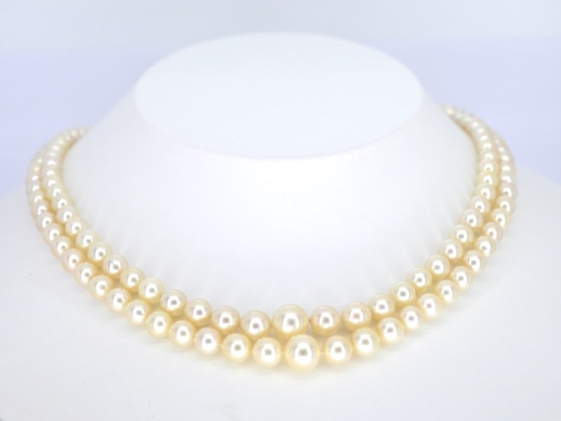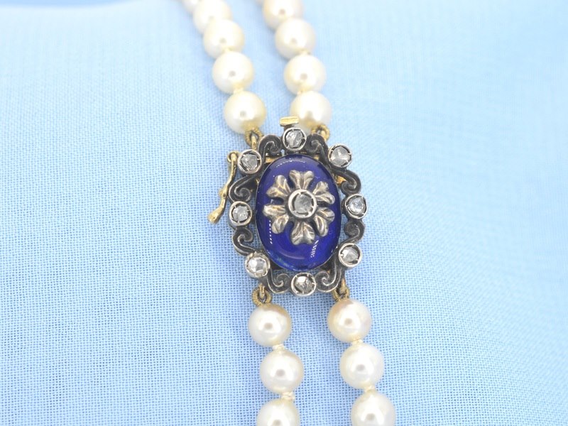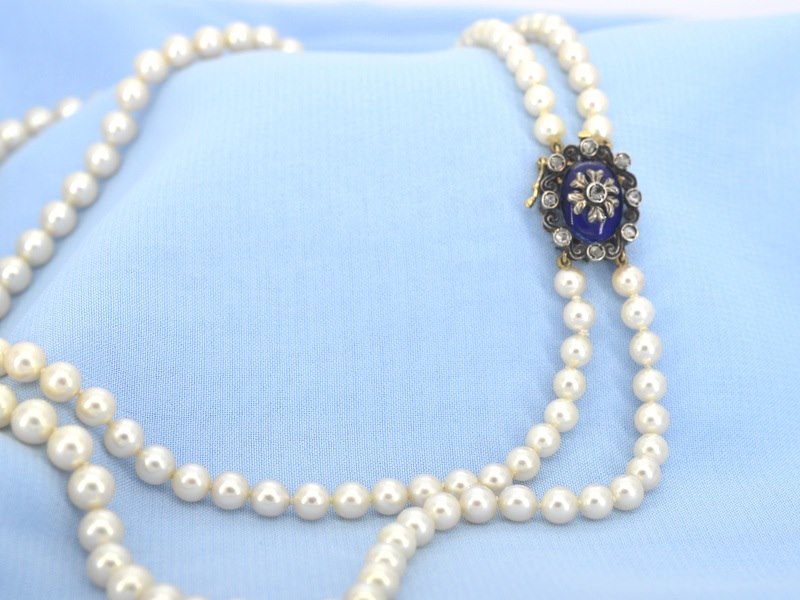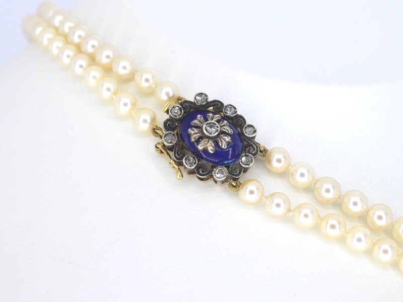 Product: Parelketting met antieke sluiting Specificaties: Diamant: Natuurlijk Aantal: 9 stuks Slijpvorm: Roos geslepen Gewicht (carat): 0.20 carat Kleur: F-G Zuiverheid: Met natuurlijke insluitsels Slijpkwaliteit: Goed Parel: Parels Aantal stuks: 136 stuks Kleur: wit Afmeting: 4.8 - 8.2 mm Luster: Glanzend Kwaliteit: AAA Juweel: Halsketting Gewicht: 39 gram Afmetingen/lengte: 42 cm Materiaal: 18K goud (750) en zilver Conditie: Antiek rond 1880 Verpakking: Luxe sieradendoos Toelichting: De kwaliteit is overgenomen van het rapport behorend bij item. De waardebepaling is een beoordeling van een gecertificeerde diamantair, gebaseerd op consumentenprijzen. Consumentenprijs: € 10.000,-