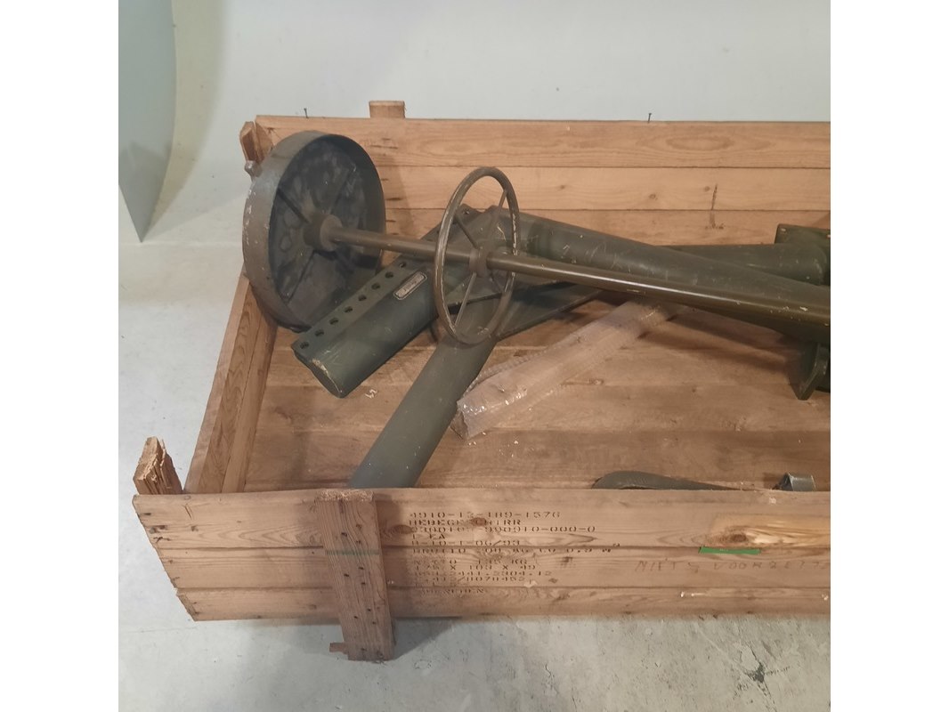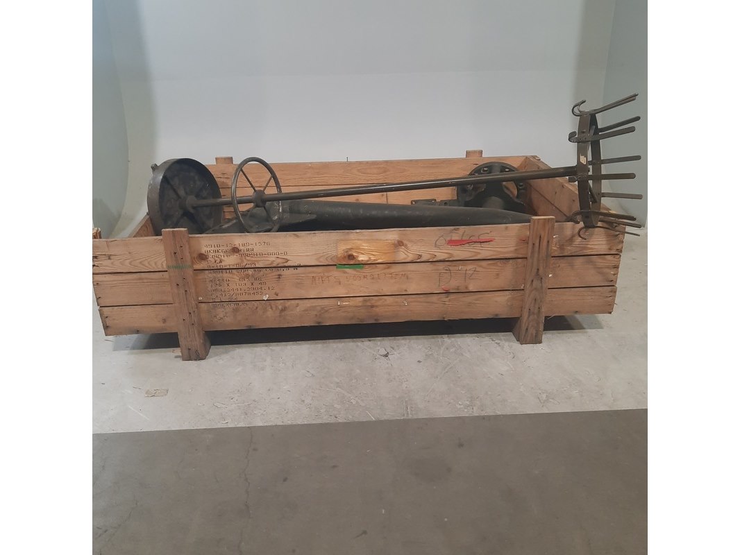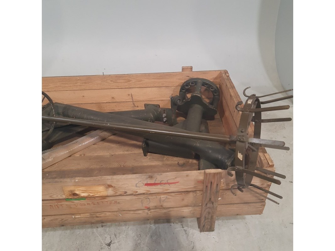 Product: Diverse metalen onderdelen Conditie: gebruikt Specificaties: Diverse afmetingen Bestaande uit o.a. hijs bok, kapstok, diverse koppelingen. Inclusief houten transportkist.