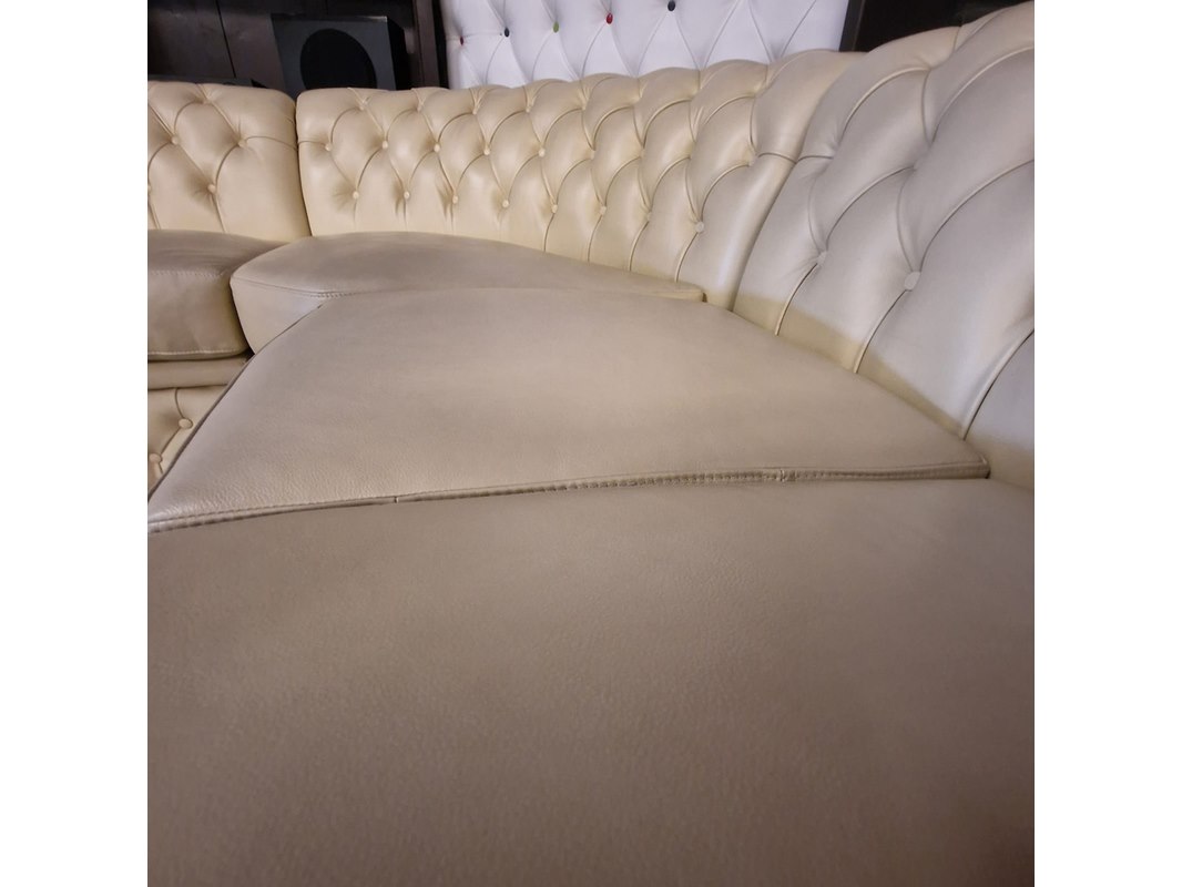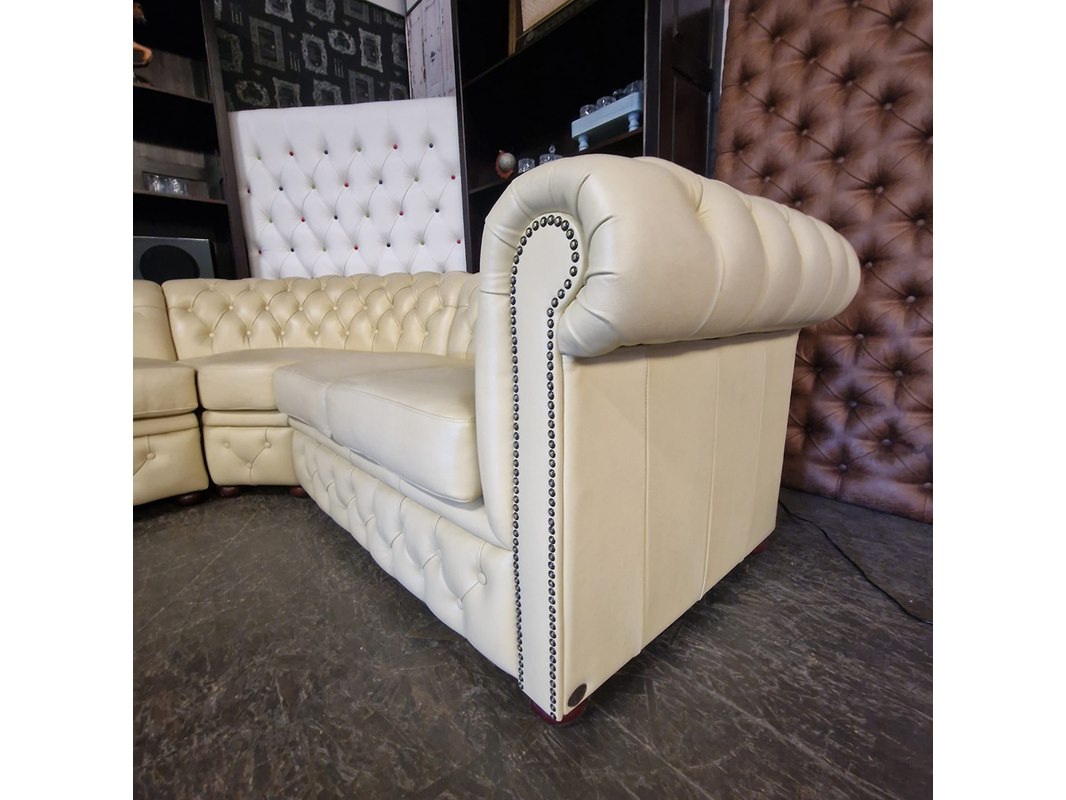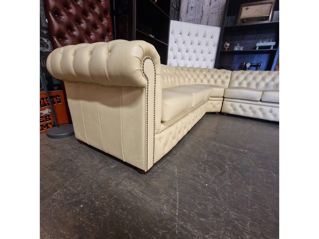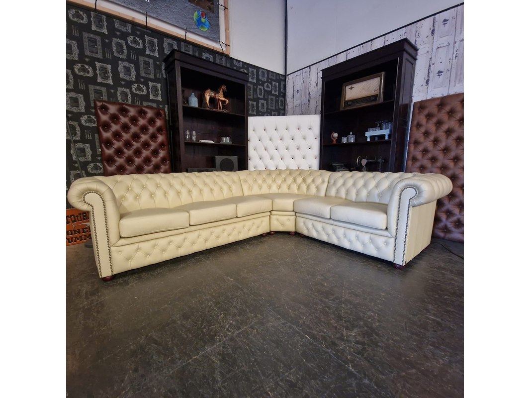 Merk: Chesterfield Product: Hoekbank Kleur: crème Materiaal: leer Afmeting: 79x290x92 Conditie: nieuw Specificaties: Afmetingen: Breedte: 290/240 cm Hoogte: 79 cm Diepte: 92 cm Zithoogte: 50 cm Zitdiepte: 56 cm