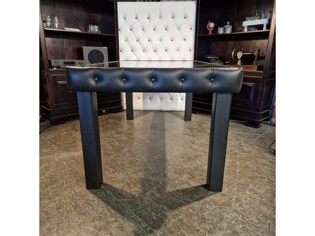 Merk: Chesterfield Product: Eetkamertafel Kleur: zwart Materiaal: leer Afmeting: 82x102x184 Conditie: nieuw Specificaties: Afmetingen: Breedte: 102 cm Hoogte: 82 cm Diepte: 184 cm