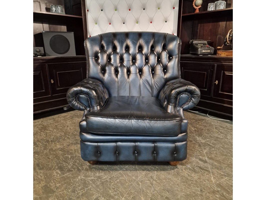 Merk: Chesterfield Product: Fauteuil Kleur: blauw Materiaal: leer Afmeting: 97x97x84 Conditie: gebruikt Specificaties: Afmetingen: Breedte: 97 cm Hoogte: 97 cm Diepte: 84 cm
