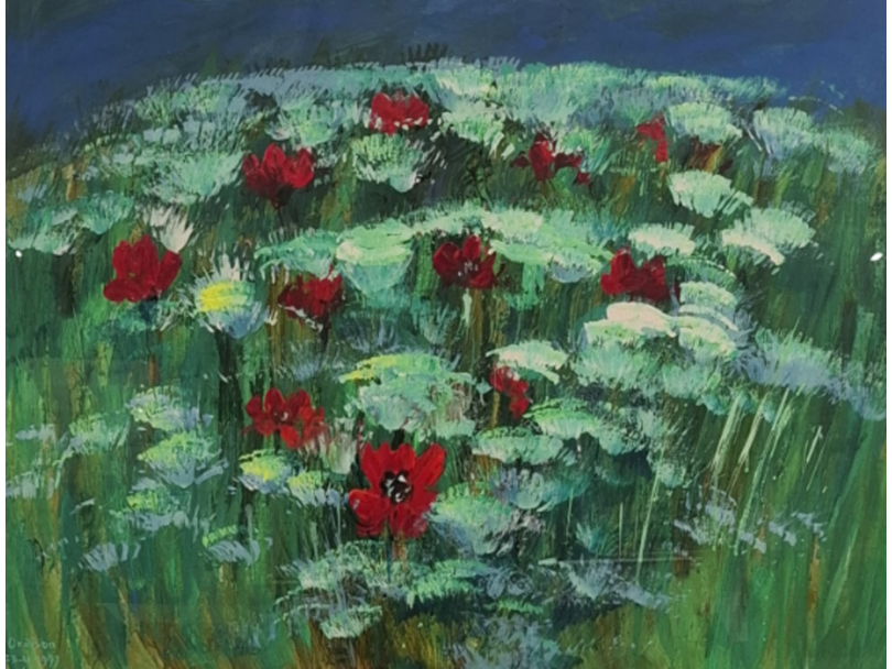 Acryl schilderij, maya wildevuur (1944-2023), klaprozen, 1997