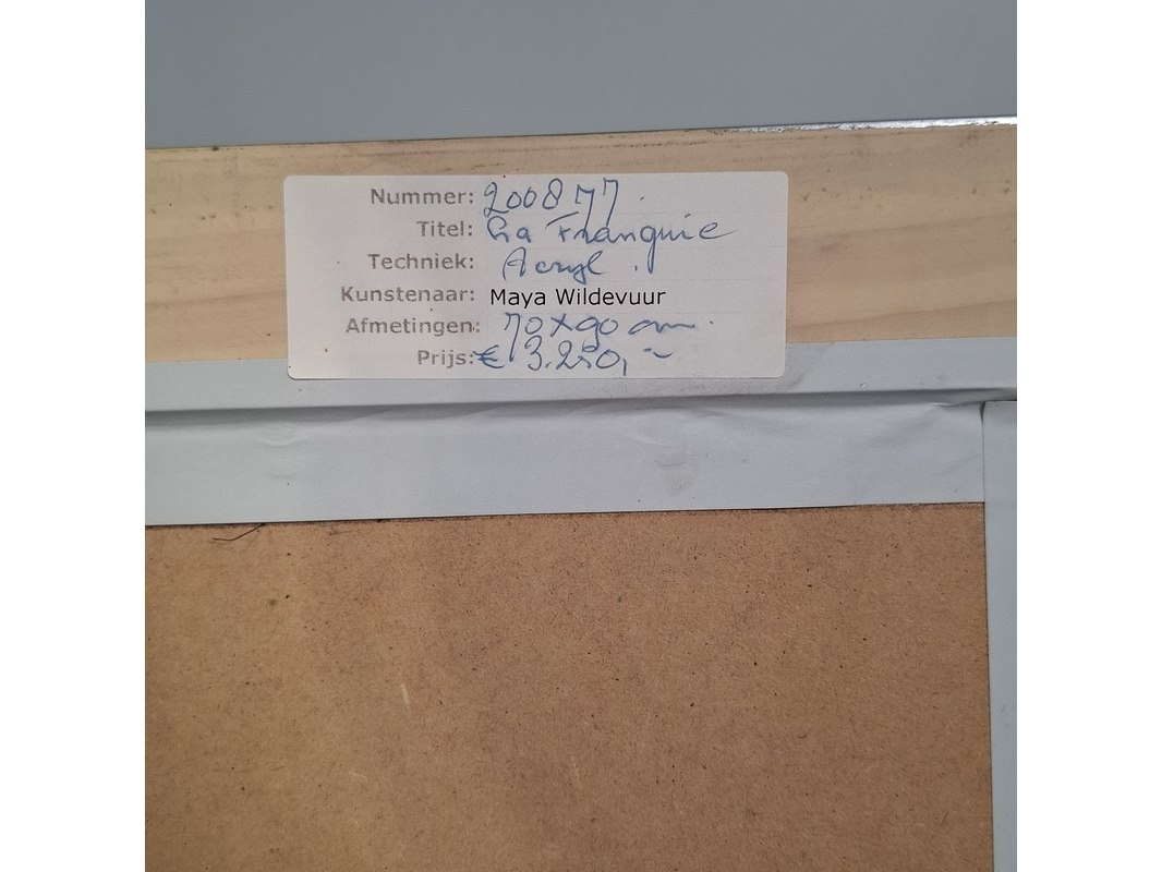 Merk: Maya Wildevuur (1944-2023) Product: Acryl schilderij Afmeting: Hxb ca. 80x100 cm BouwJaar: 2008 Specificaties: Diverse beschadigingen op lijst
