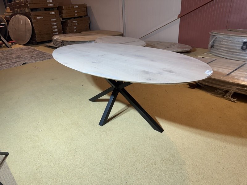 Eettafel, onbehandeld eikenhout, zwart metalen spinpoot