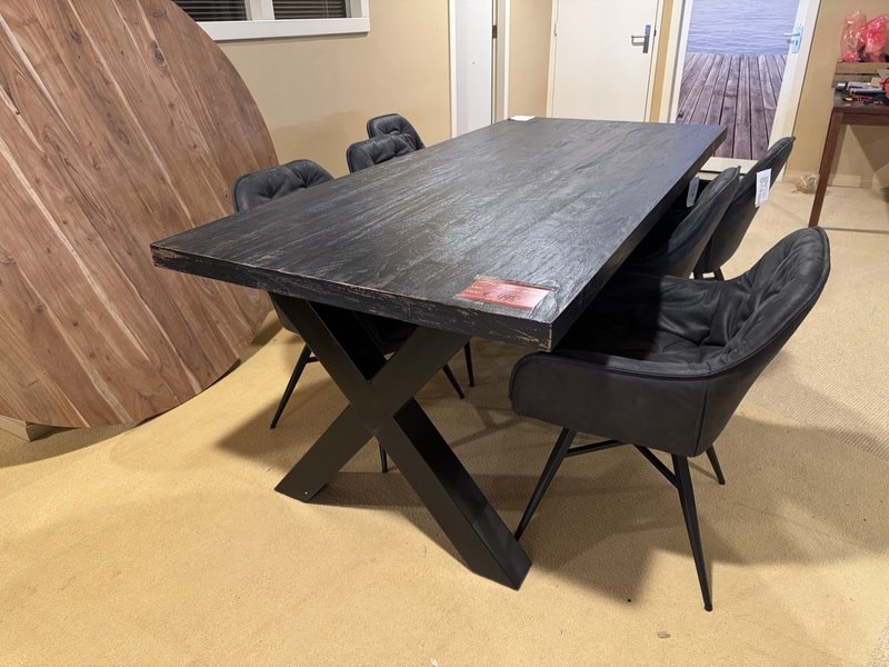 Product: Eettafel Kleur: Zwart Materiaal: Hout/metaal Afmeting: 220x100 cm Specificaties: Showmodel