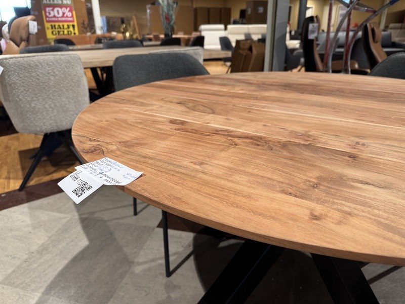 Product: Eettafel Kleur: Naturel Materiaal: Acaciahout Afmeting: 120 cm doorsnee Specificaties: Showmodel