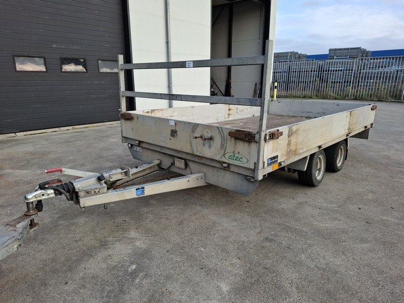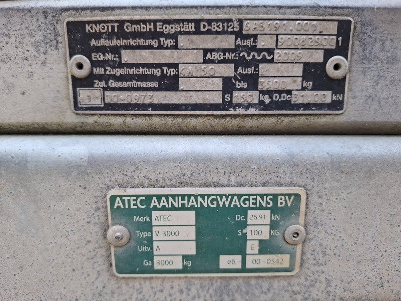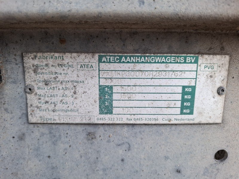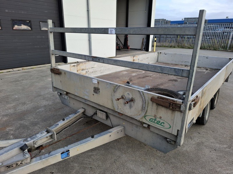 Merk: Atec Product: Tandemasaanhanger Afmeting: bakmaat lxb ca. 350x190 cm BouwJaar: 2009 Conditie: gebruikt Specificaties: Kenteken: 10-WF-BJ Massa rijklaar: 580 kg Toegestane max. massa voertuig: 3000 kg Neuswiel los erbij Assen getordeerd