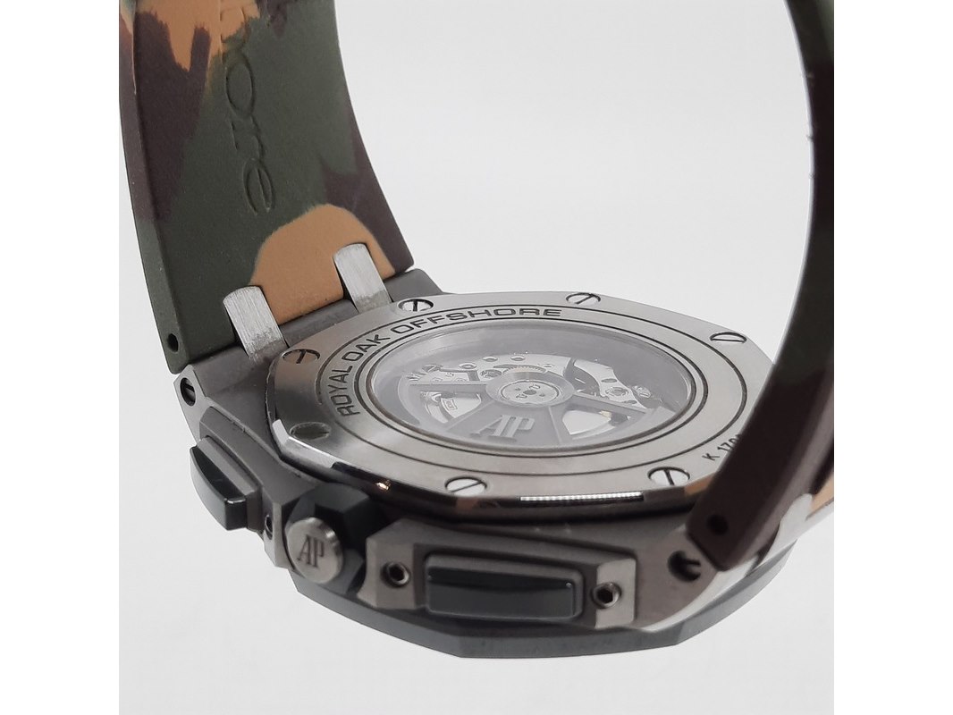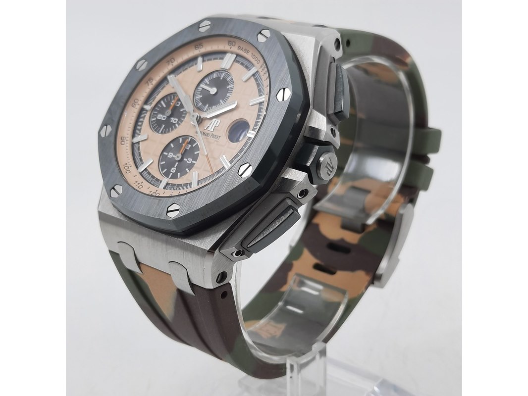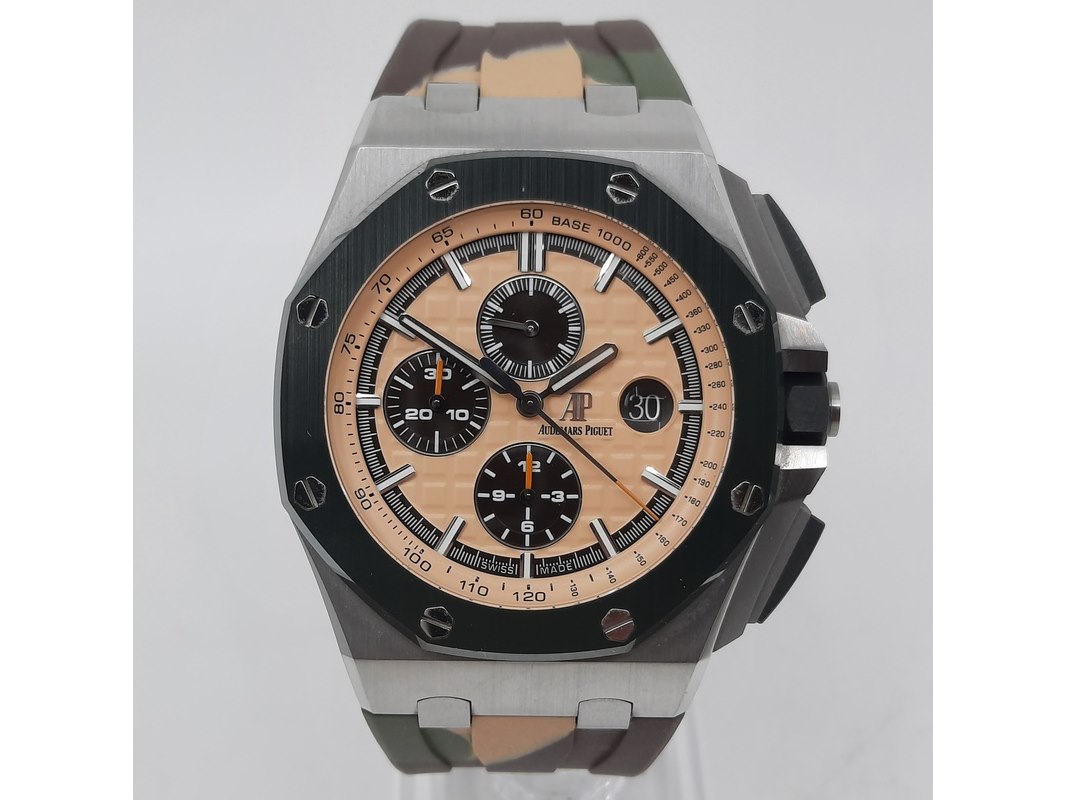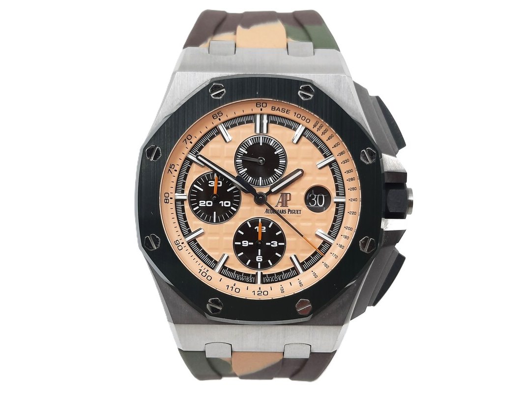 Merk: Audemars Piguet Product: Heren polshorloge Conditie: gebruikt Specificaties: Een stalen heren polshorloge Audemars Piguet Royal Oak Offshore. Met glazen achterdeksel, gele wijzerplaat, chronograaf en rubber band met gesp. Geen doos en geen certificaat.
