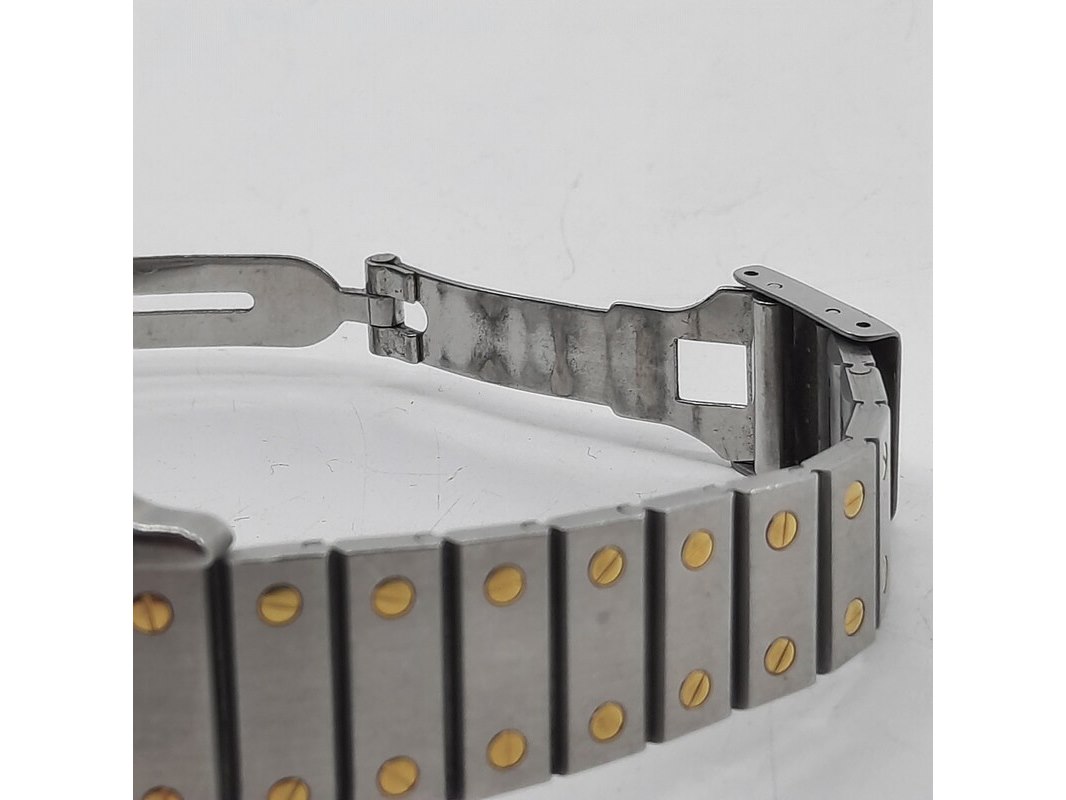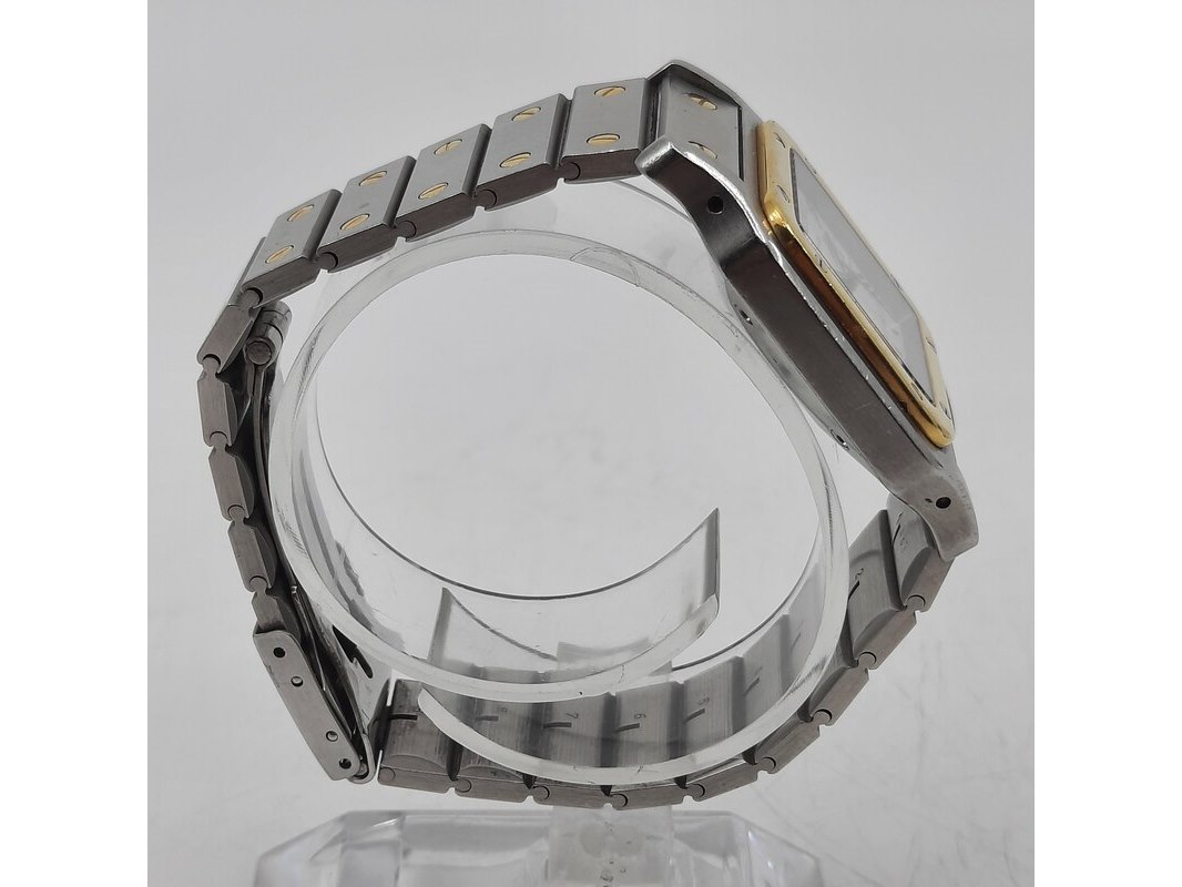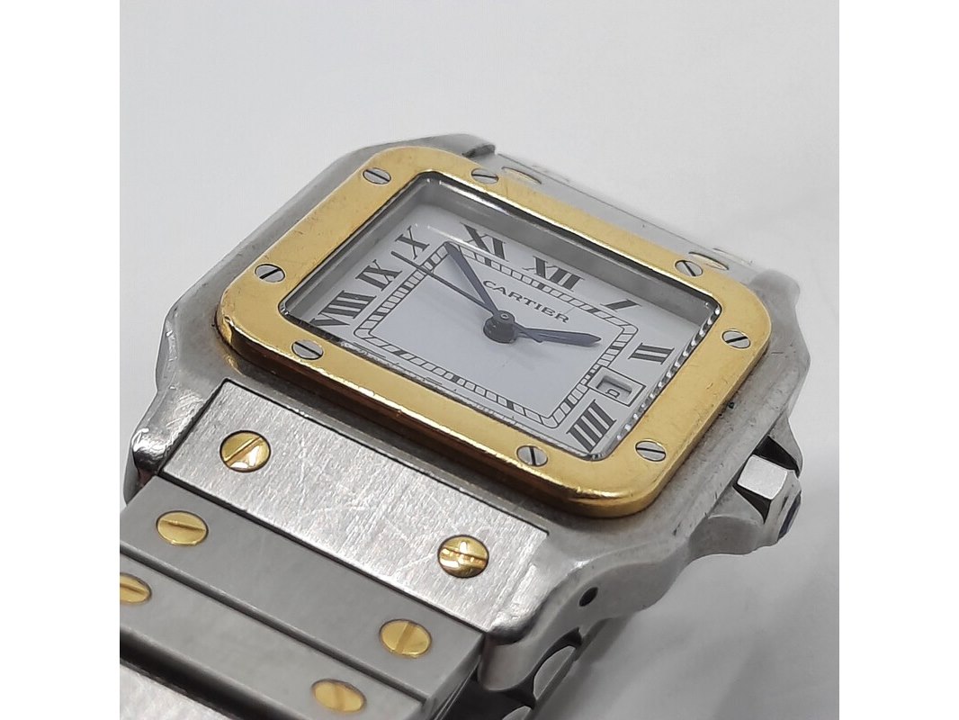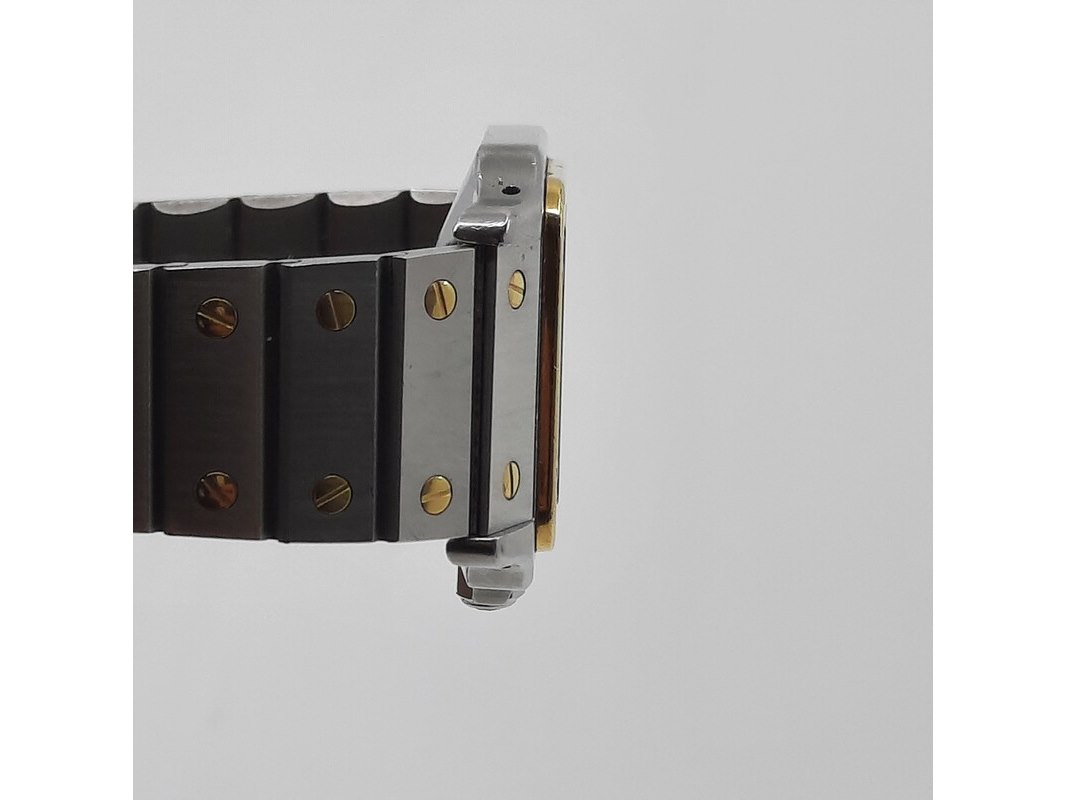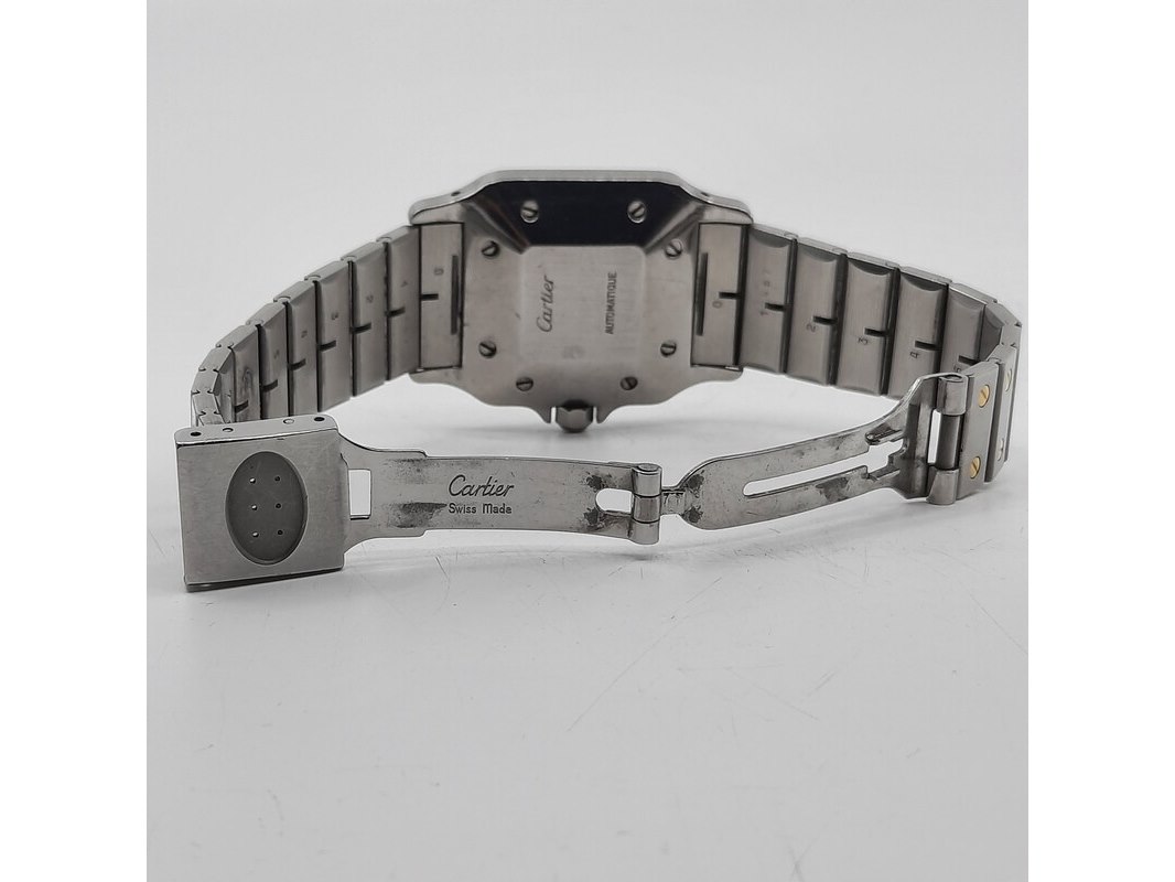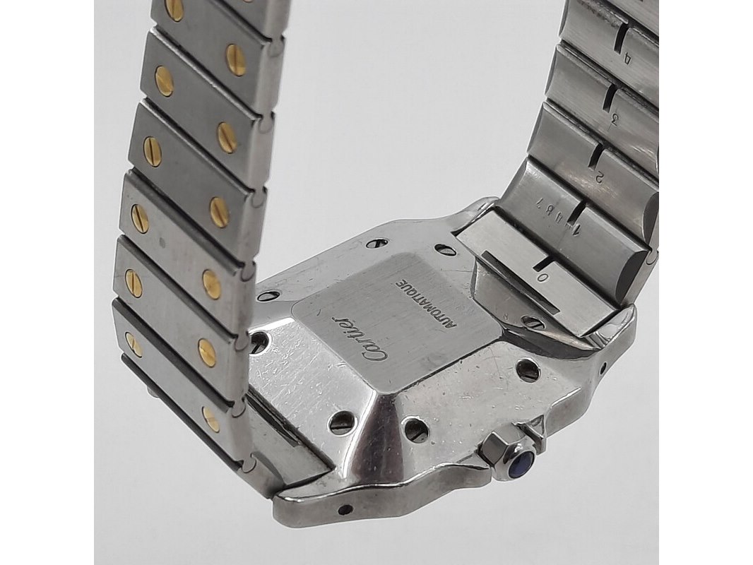 Merk: Cartier Product: Heren polshorloge Conditie: gebruikt Specificaties: Een staal met gouden heren polshorloge, Cartier Santos Automatic. Met stalen kast, gouden lunet, automatisch uurwerk en stalen band met gouden schroeven. Gouden logo op de sluiting ontbreekt. Geen doos en geen certificaat.