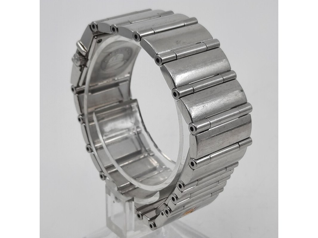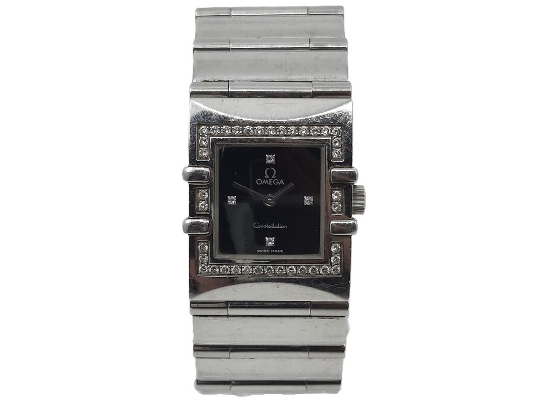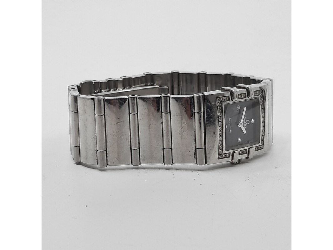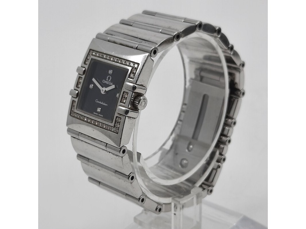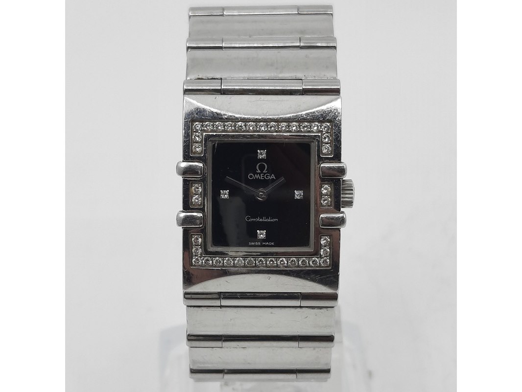 Merk: Omega Product: Dames polshorloge Conditie: gebruikt Specificaties: Een stalen dames polshorloge, Omega Constellation Quadra. Met diamanten lunet, zwarte wijzerplaat, quartz en stalen band met vouwsluiting. Geen doos en geen certificaat.