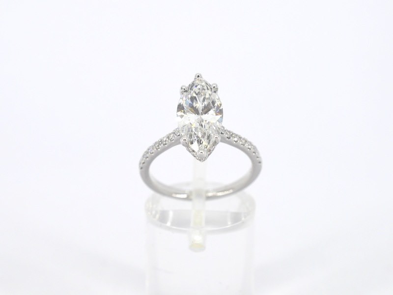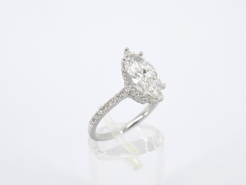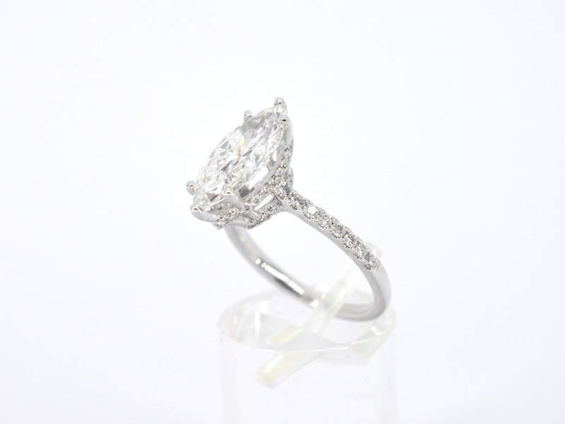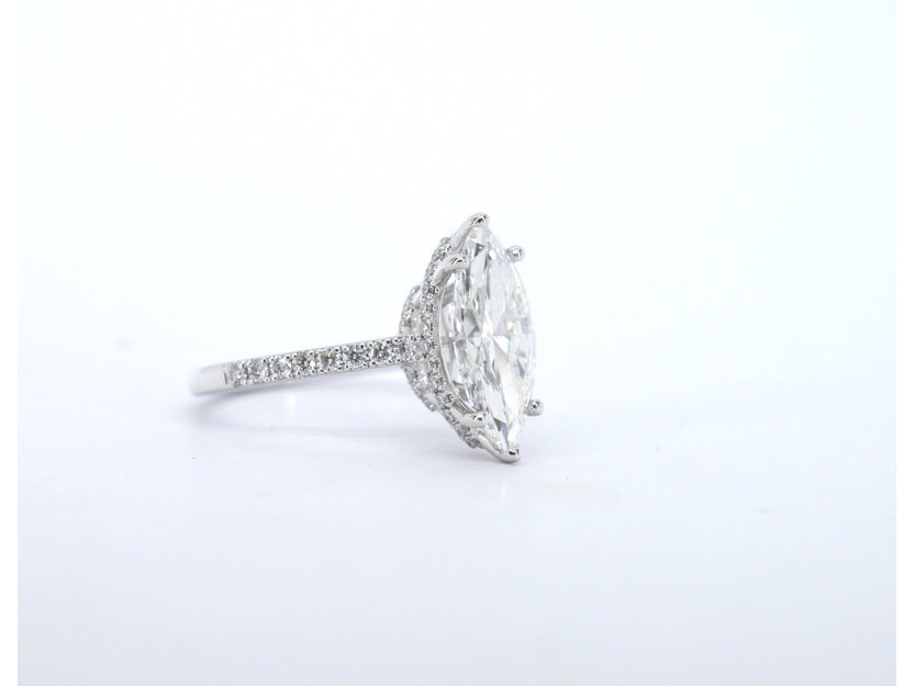 Product: Witgouden solitaire ring met een marquise diamant van 2.00 carat met hidden Halo Specificaties: Diamant: Natuurlijk Aantal: 1 stuk Slijpvorm: Marquise geslepen Gewicht (carat): 2.00 Kleur: F-G Zuiverheid: SI Slijpkwaliteit: zeer mooi Diamant (secundair): Natuurlijk Aantal diamanten: 54 stuks Slijpvorm: Briljant geslepen Gewicht (carat): 0.50 carat Kleur: F Zuiverheid: VS Slijpkwaliteit: Zeer mooi Juweel: Ring Gewicht: 3 gram Ringmaat (op maat gemaakt*): 53 (17 mm) Materiaal: 18K goud (750) Conditie: Nieuw Verpakking: Luxe sieradendoos Toelichting: De kwaliteit is overgenomen van het rapport behorend bij item. De waardebepaling is een beoordeling van een gecertificeerde diamantair, gebaseerd op consumentenprijzen. Consumentenprijs: € 60.900,-