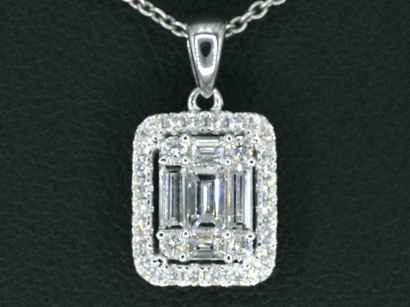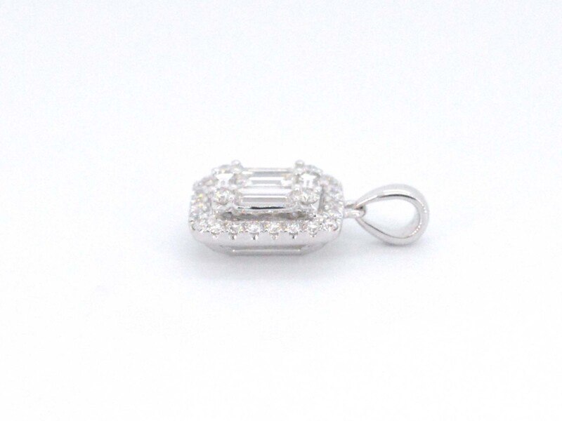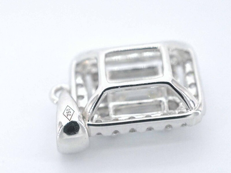 Product: Witgouden hanger met diamanten en emerald shape in het midden Specificaties: Diamant: Natuurlijk Slijpvorm: Briljant geslepen en baguette geslepen Gewicht (carat): 0.80 carat Kleur: F-G Zuiverheid: VS Slijpkwaliteit: Zeer mooi Juweel: Hanger (excl. ketting) Gewicht: 1.5 gram Materiaal: 18K goud (750) Conditie: Nieuw Verpakking: Luxe sieradendoos Toelichting: De kwaliteit is overgenomen van het rapport behorend bij item. De waardebepaling is een beoordeling van een gecertificeerde diamantair, gebaseerd op consumentenprijzen. Consumentenprijs: € 6.930,-