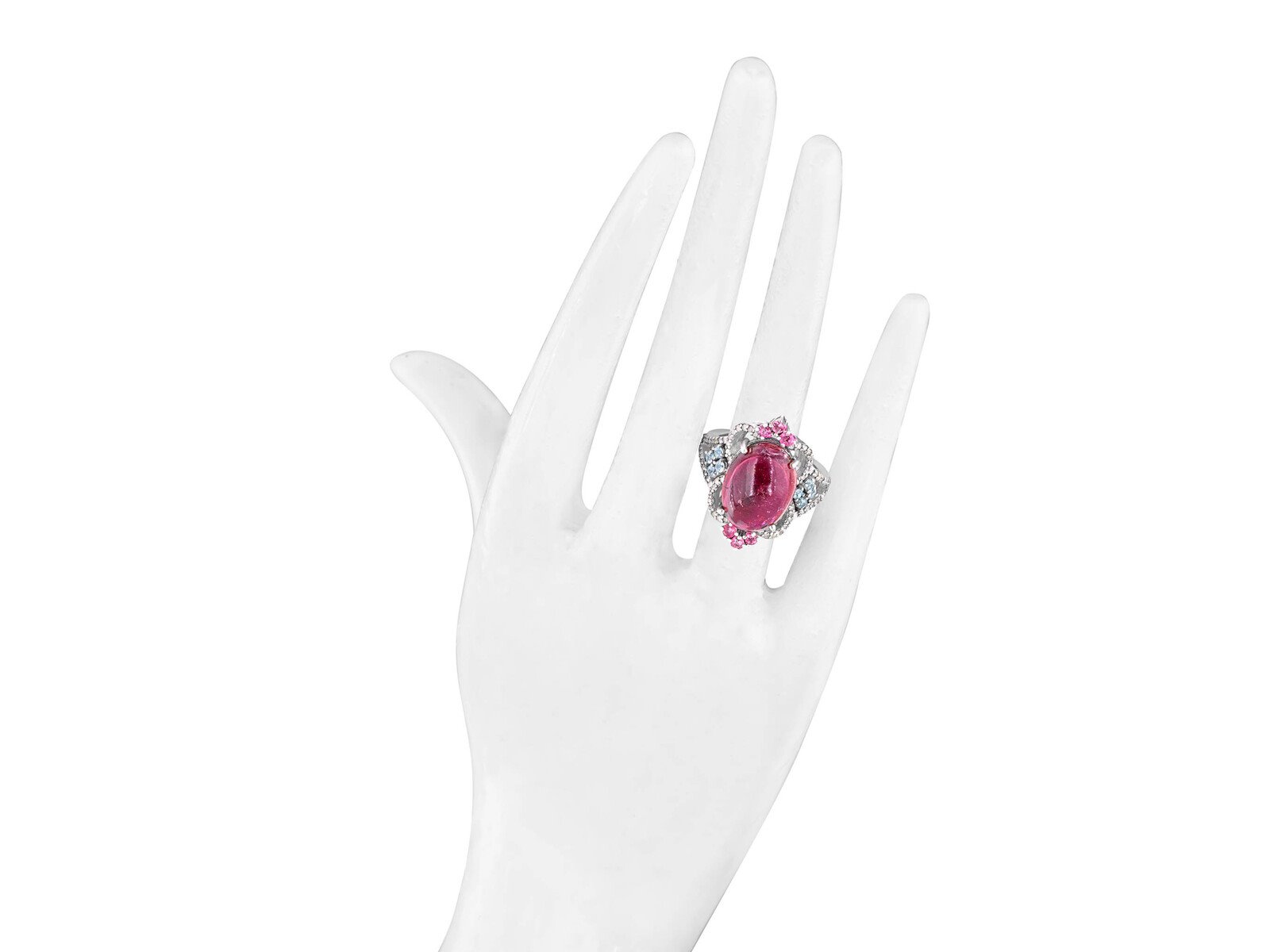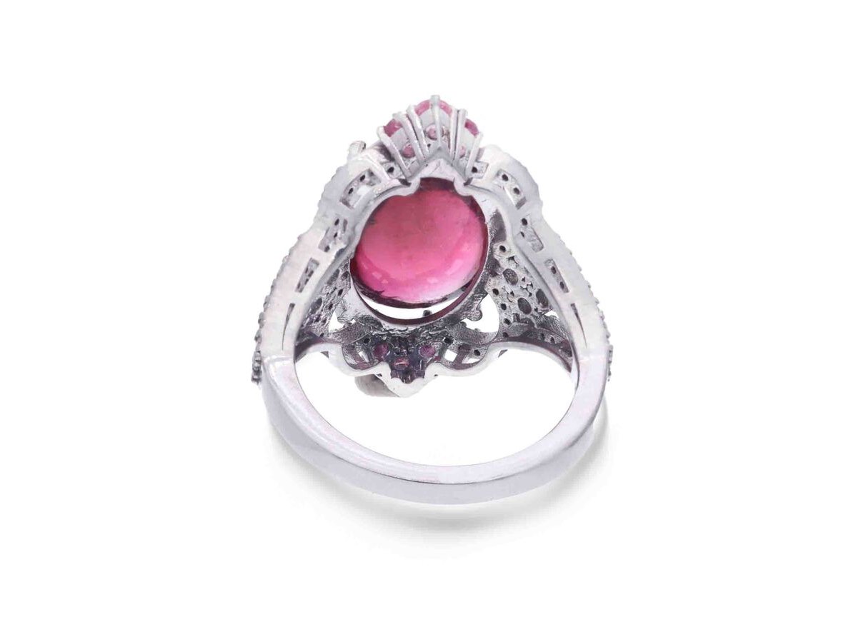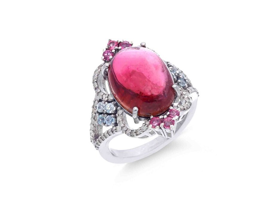 Product: Ring met een grote donkerroze toermalijn blauwe topazen en natuurlijke diamanten Specificaties: Diamant: Echte Natuurlijk diamanten Gewicht (carat): 0.45 carat Zuiverheid: Met natuurlijke insluitsels Edelsteen: Toermalijn Slijpvorm: Ovaal cabochon Gewicht (carat): 9.50 carat Kleur: Donker roze Zuiverheid: Met natuurlijke insluitsels Edelsteen (secundair): Topaas Slijpvorm: Rind geslepen Kleur: Blauw topaas Zuiverheid: Met natuurlijke insluitsels Juweel: Ring Gewicht: 6 gram Ringmaat (op maat gemaakt*): 54 (17.25 mm) Materiaal: Hoge kwaliteit Sterling zilver Conditie: Vintage Verpakking: Sieradendoos of fluwelen etui Toelichting: De kwaliteit is overgenomen van het rapport behorend bij item. De waardebepaling is een beoordeling van een gecertificeerde diamantair, gebaseerd op consumentenprijzen. Extra informatie: Dit is een met de hand vervaardigd sieraad. Consumentenprijs: € 2.310,-