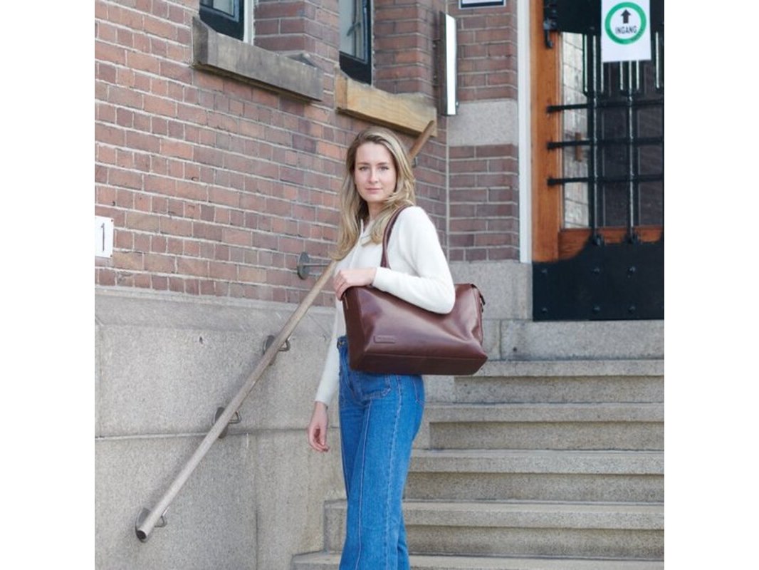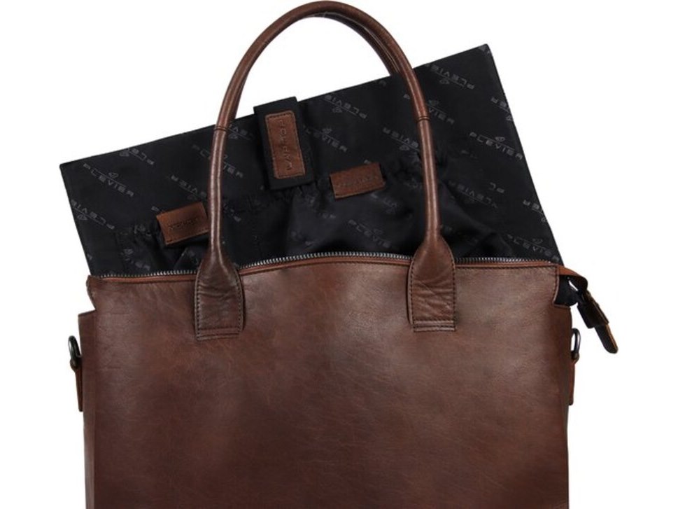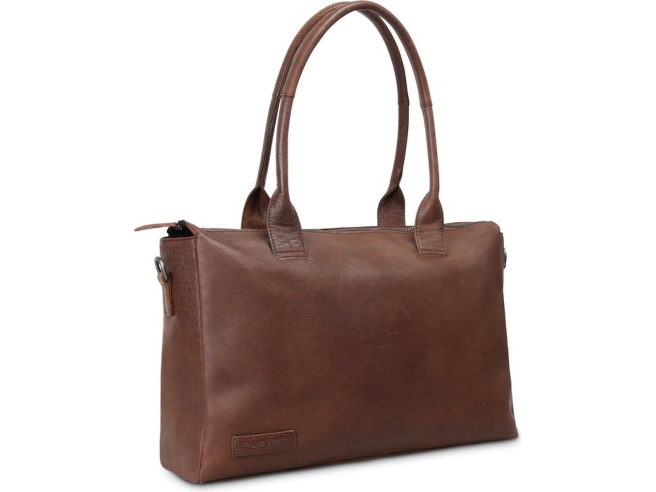 Merk: Plevier Product: Schoudertas Kleur: donkerbruin Materiaal: leer Afmeting: 16 inch Conditie: nieuw
