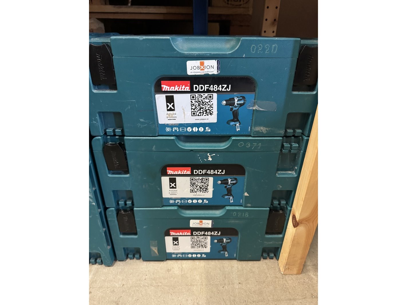 Merk: Makita Product: Bouwgereedschap in M-box Conditie: gebruikt Specificaties: 3x DDF484ZJ 1x DHR242ZJV 1x DJV182ZJ 1x DHS630ZJ