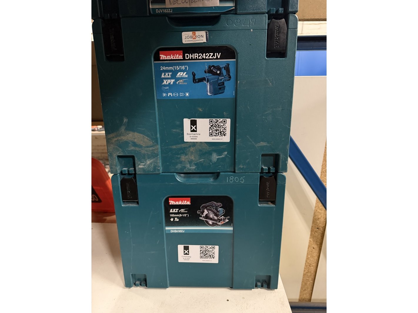 4x bouwgereedschap in m-box met 1x accu, 1x lader makita, dhs630zj, dhr242zjv, 2x djv182zj