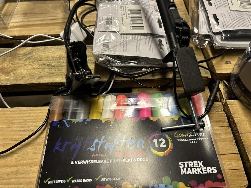 Partij diversen w.o. bureaulamp, fietsmand, krijtstiften w.o. basil