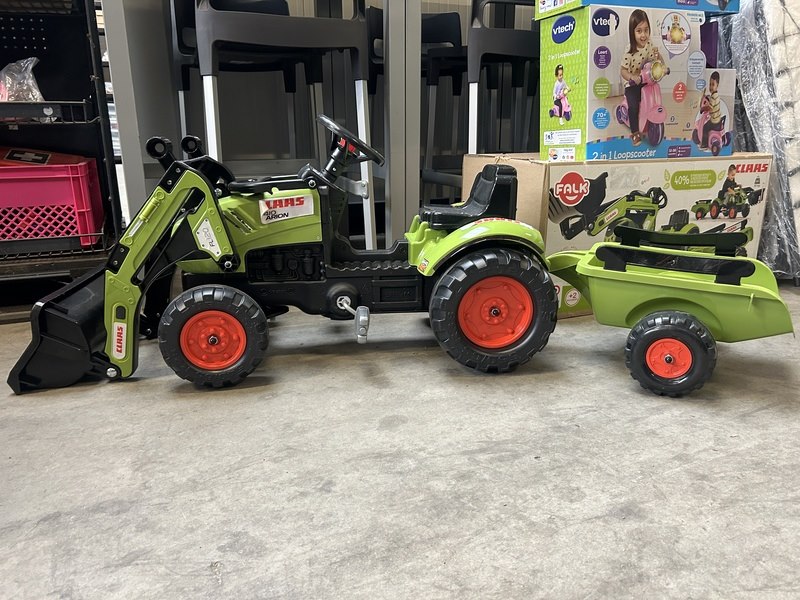 Merk: Falk Product: Claas traptractor met aanhanger Specificaties: Showroom model. Beschadigd.