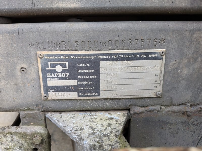 Merk: HAPERT Product: Aanhangwagen BouwJaar: 1999 Conditie: Gebruikt Specificaties: Basiskenmerken Kenteken: WX-27-XD Goedkeuringsnummer: HAPA 1320 Identificatienummer: *XLH*BL2000*00637576* Datum eerste toelating: 8 december 1999 Maten & Gewichten Voertuig breedte: 1.750 mm Laadvloer (LxB) : 2.800 x 1.600 mm Wielbasis: 740 mm Massa rijklaar: 681 kg Max. massa voertuig: 1.800 kg Laadvermogen: 1.119 kg