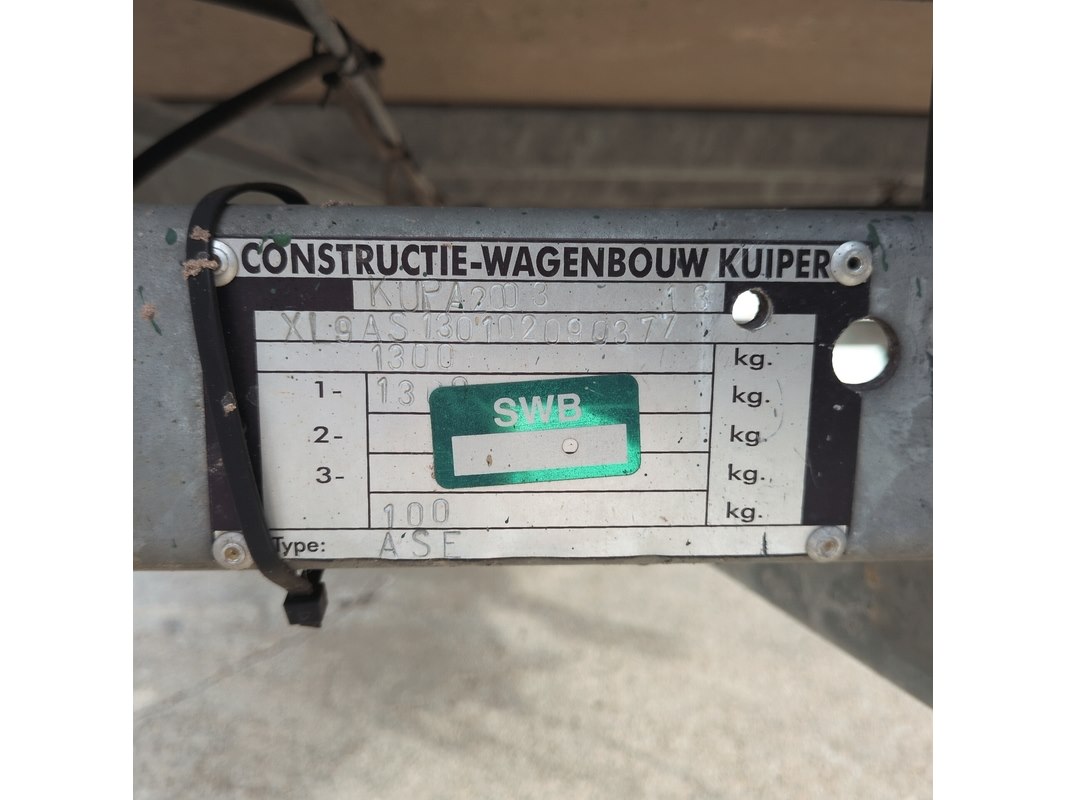 Merk: Kuiper Product: Schaftwagen Afmeting: Afmetingen opbouw (LxBxH): 3.800 x 2.160 x 2.200 mm BouwJaar: 2003 Conditie: Gebruikt Specificaties: Basiskenmerken Kenteken: WH-RX-13 Goedkeuringsnummer: KUPA2003 13 Identificatienummer: XL9AS130102090377 Datum eerste toelating: 12 augustus 2003 Maten & Gewichten Voertuig lengte: 5.700 mm Voertuig breedte: 2.160 mm Opbouw (LxBxH) : 3.800 x 2.160 x 2.200 mm Massa rijklaar: 830 kg Max. massa voertuig: 1.300 kg Laadvermogen: 470 kg