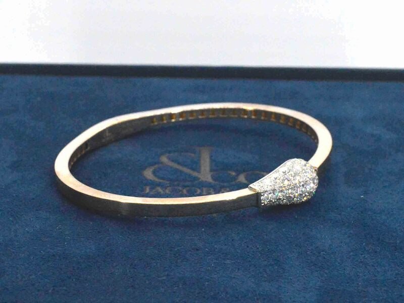 Product: Jacob & Co - Match - Rosegouden design armband met natuurlijke diamanten Specificaties: Diamant: Natuurlijk Slijpvorm: Briljant geslepen Gewicht (carat): 1.09 carat Kleur: F Zuiverheid: VVS Juweel: Armband Merk: Jacob & Co Model: Match Serienummer: 92353XXX Gewicht: 11 gram Materiaal: 18K goud (750) Conditie: Zo goed als nieuw Verpakking: Originele sieradendoos Toelichting: De kwaliteit is overgenomen van het rapport behorend bij item. De waardebepaling is een beoordeling van een gecertificeerde diamantair, gebaseerd op consumentenprijzen. Consumentenprijs: € 12.000,- *Ringen kunnen mogelijk op maat gemaakt worden.