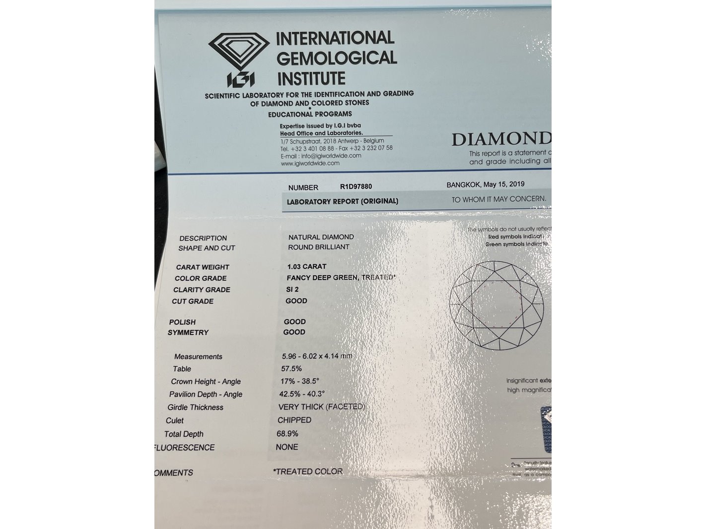 Product: Diamant - 1.03 carat groene diamant (gecertificeerd) Specificaties: Aantal: 1 stuk Slijpvorm: Briljant geslepen Gewicht (carat): 1.03 carat Kleur: Fancy deep green (enhanced) Zuiverheid: SI2 Certificaat: IGI Certificaat nummer: R1D97880 Conditie: Nieuw Verpakking: Edelsteendoos Toelichting: De kwaliteit is overgenomen van het rapport behorend bij item. De waardebepaling is een beoordeling van een gecertificeerde diamantair, gebaseerd op consumentenprijzen. Consumentenprijs: € 5.540,- *Ringen kunnen mogelijk op maat gemaakt worden.