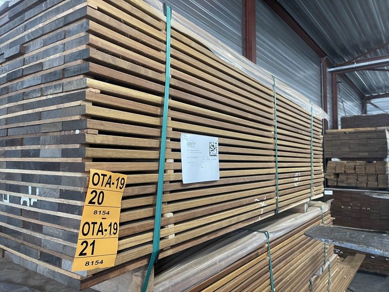 Product: Guyana Ipé planken geschaafd Materiaal: Djindja Udu Afmeting: 21x90mm, lengte 215cm Conditie: nieuw
